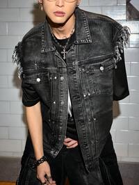 Street Life Chaleco vaquero casual de un solo pecho con bolsillo, dobladillo deshilachado y bordado de estrellas y lunas para hombres