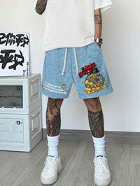 Astro Boy X ROMWE Pantalones cortos con texto y figura de dibujos animados para hombres, adecuados para deportes o uso casual en verano
