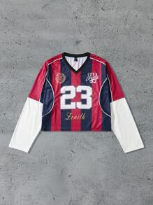 Prep Camiseta de manga larga de 2 en 1 con parches para hombre, estilo jersey holgado y corto, para otoño