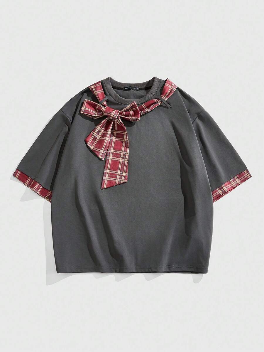 Prep Corbata de moño a cuadros para hombre, camiseta holgada de estilo universitario de los años 2000