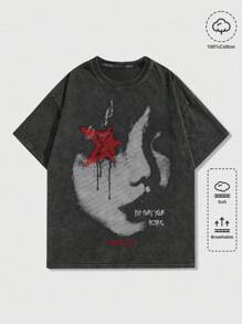 Grunge Punk Camiseta de manga corta con estampado de retrato de hombre y copos de nieve, adecuada para uso diario en primavera/verano