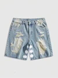Shorts vaqueros holgados y casuales con parche floral estampado y desgastados para hombre