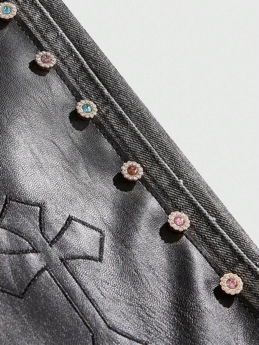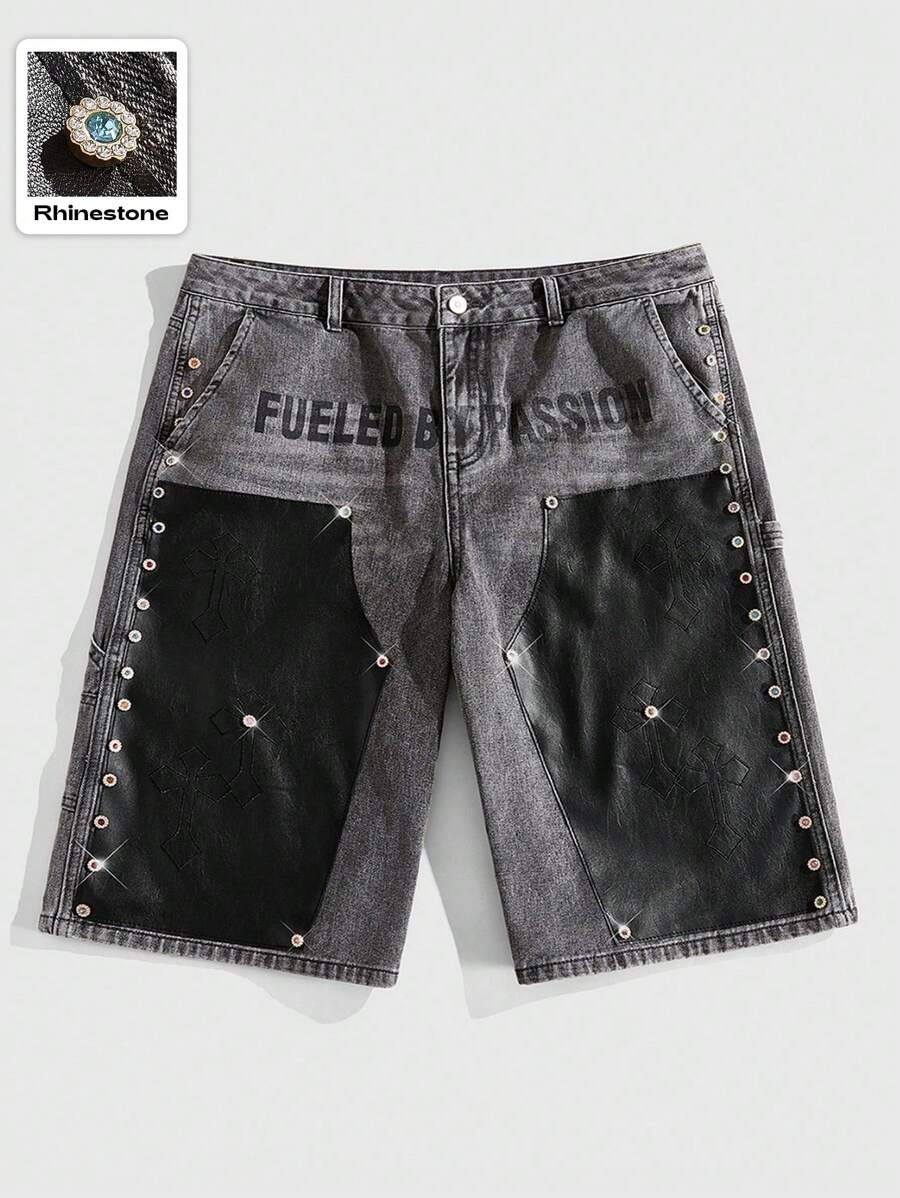 Street Life Pantalones cortos de mezclilla cargo con parches de rhinestone para hombres