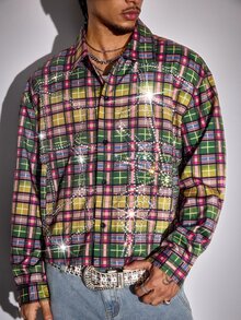 Street Life Camisa de hombre con estampado de cuadros con rhinestones, de manga larga, estilo urbano estadounidense