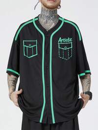 Prep Camisa holgada de uso diario y casual con estampado de letras y números, y ribete de contraste, para hombre, verano