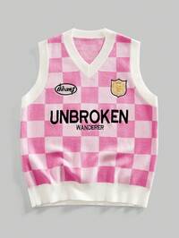 Chaleco holgado de punto con patrón de bordado de tablero de ajedrez retro