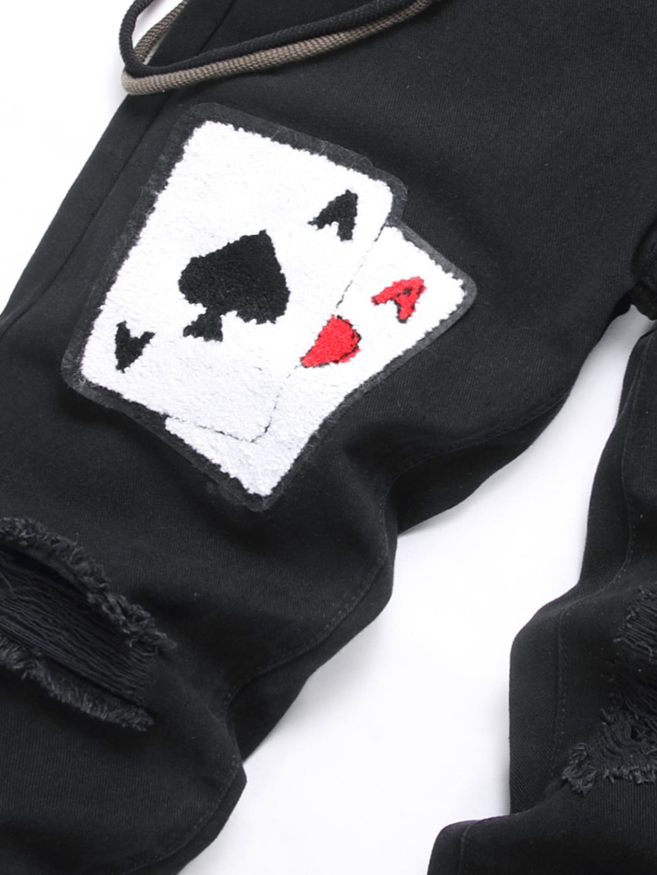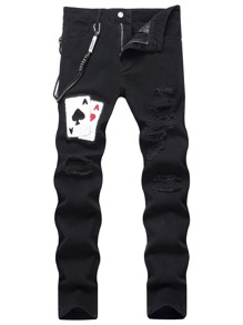 Jeans con diseño de cartas de juego, decorados con cadenas deshilachadas y rotas para hombres