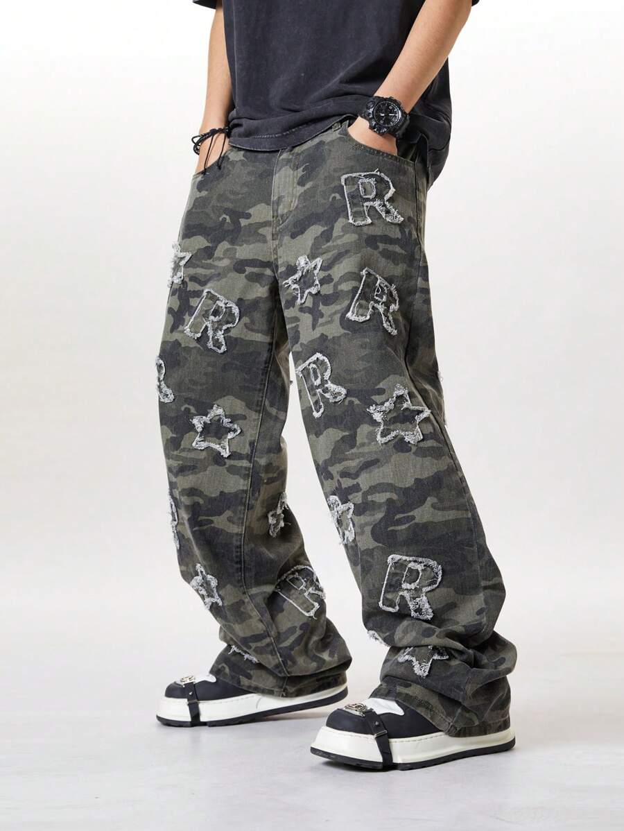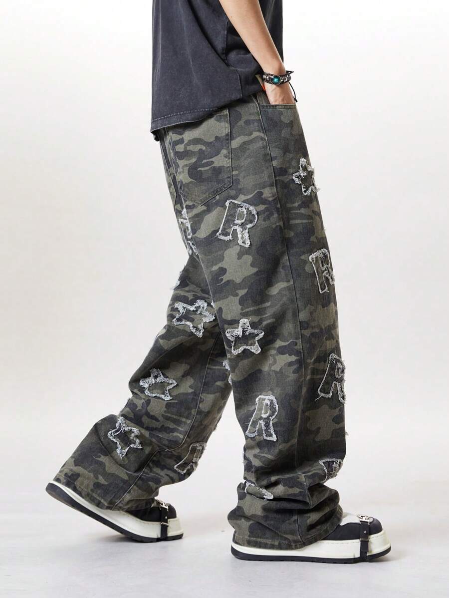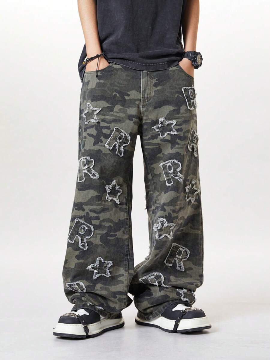 Jeans casuales de hombre con estampado de camuflaje y parche con letra
