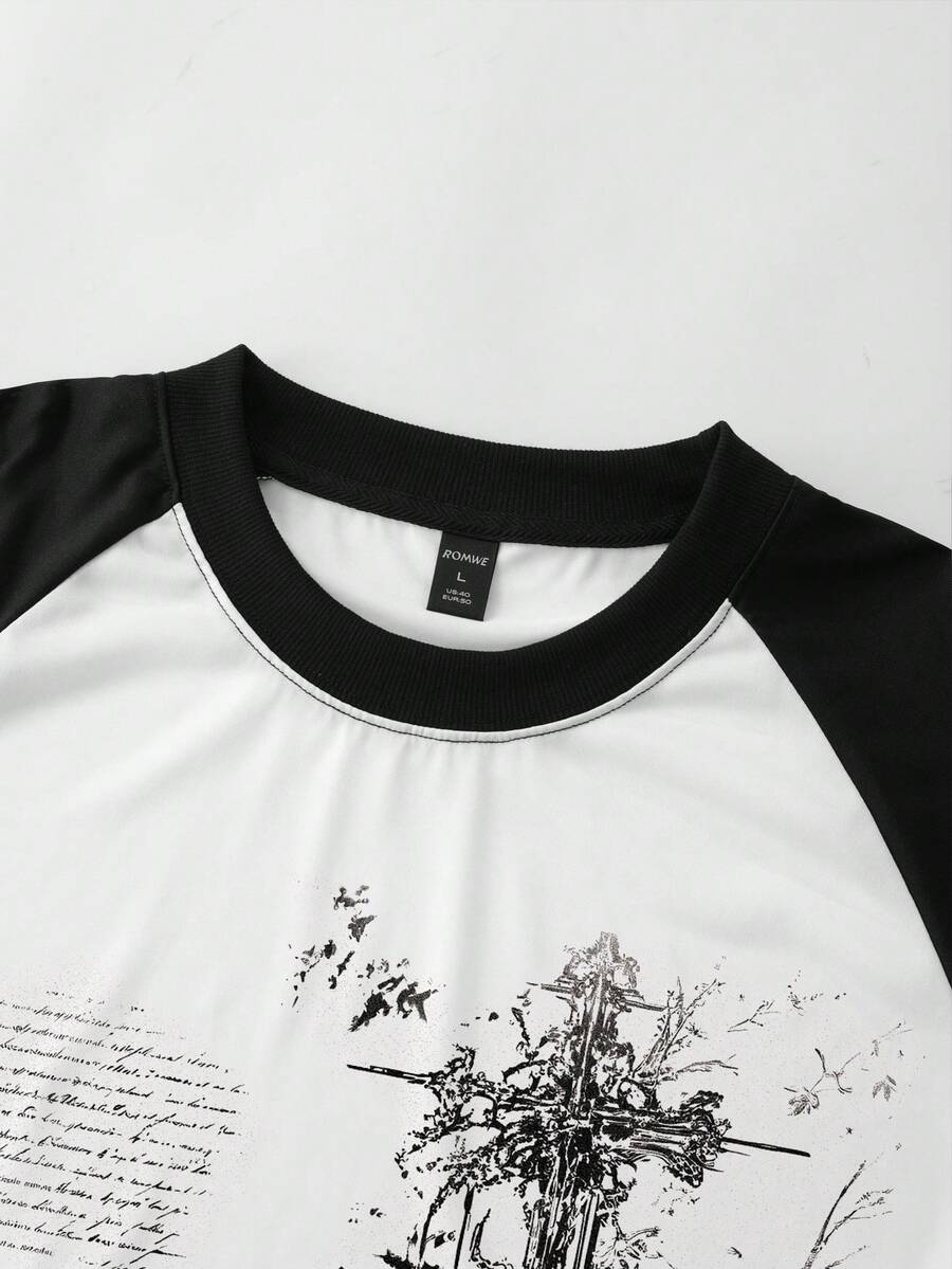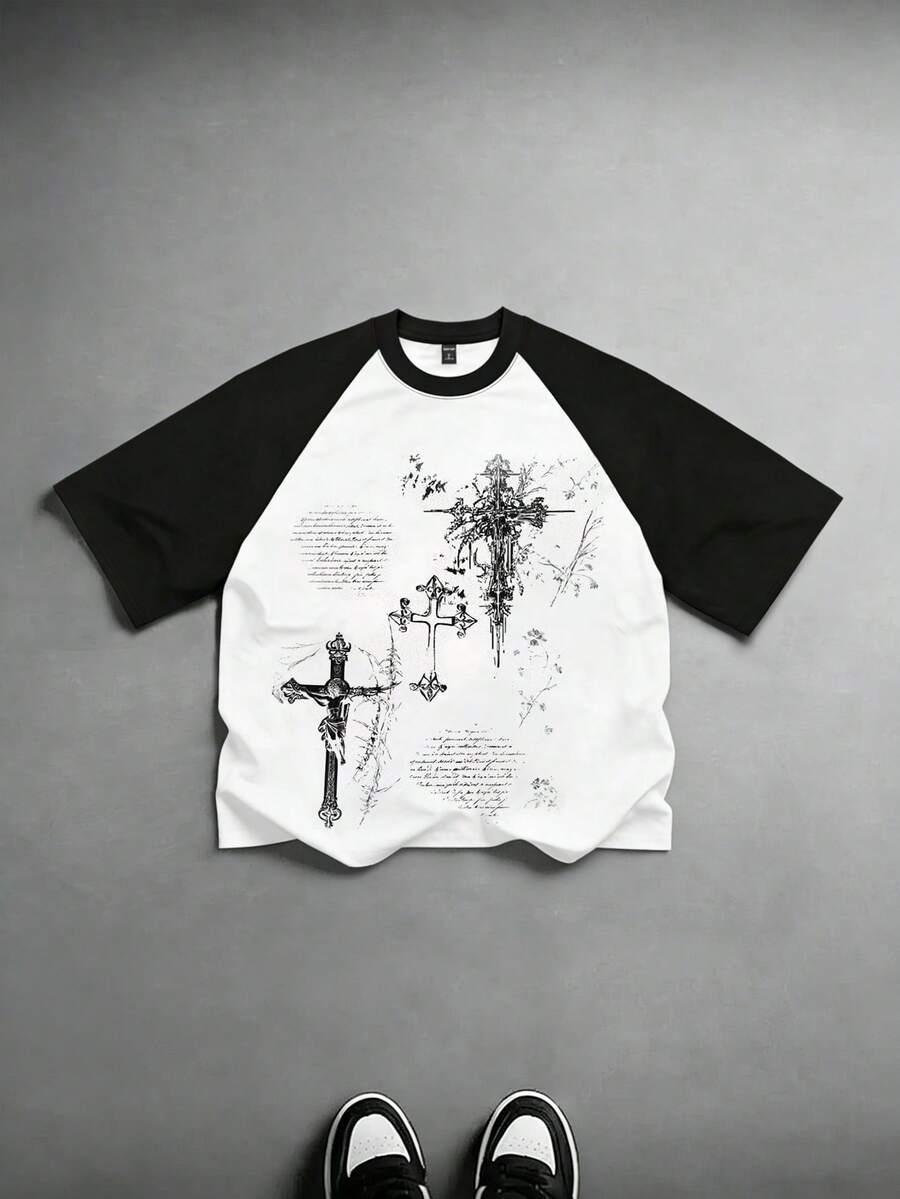 Camiseta casual de manga raglán para hombre con estampado de cruz en negro y blanco