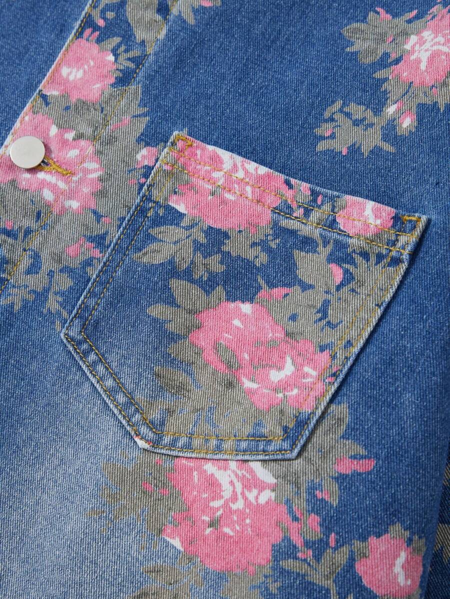 Chaqueta vaquera casual holgada de una sola hilera de botones con bolsillo y manga corta con estampado floral para hombre