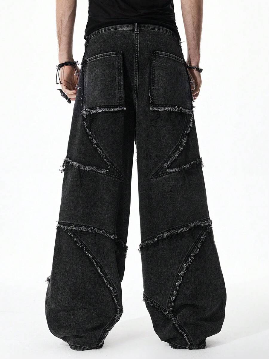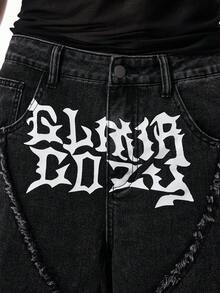 Jeans casuales holgados con bolsillo estampado con letras y efecto desgastado para hombres