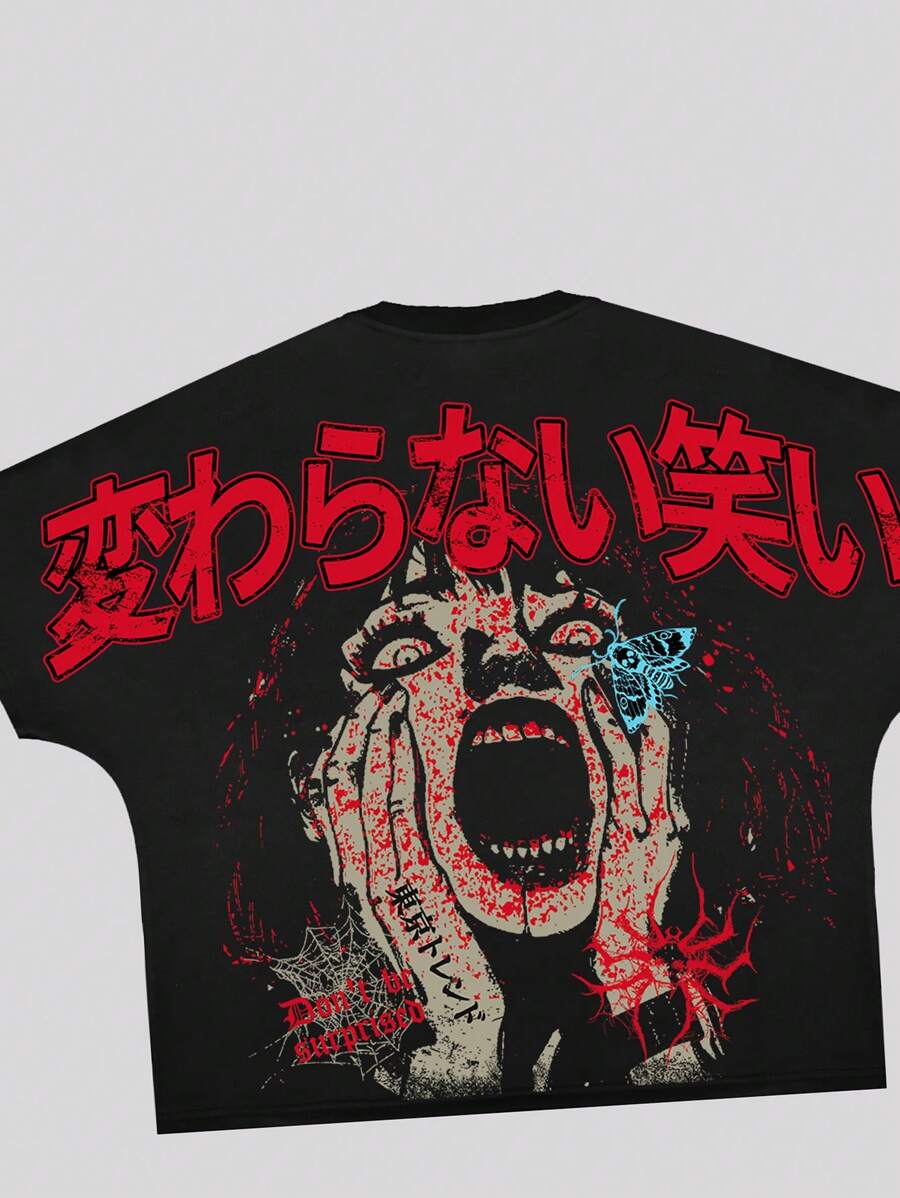Camiseta de manga corta holgada y acortada con estampado de personaje de anime para hombres