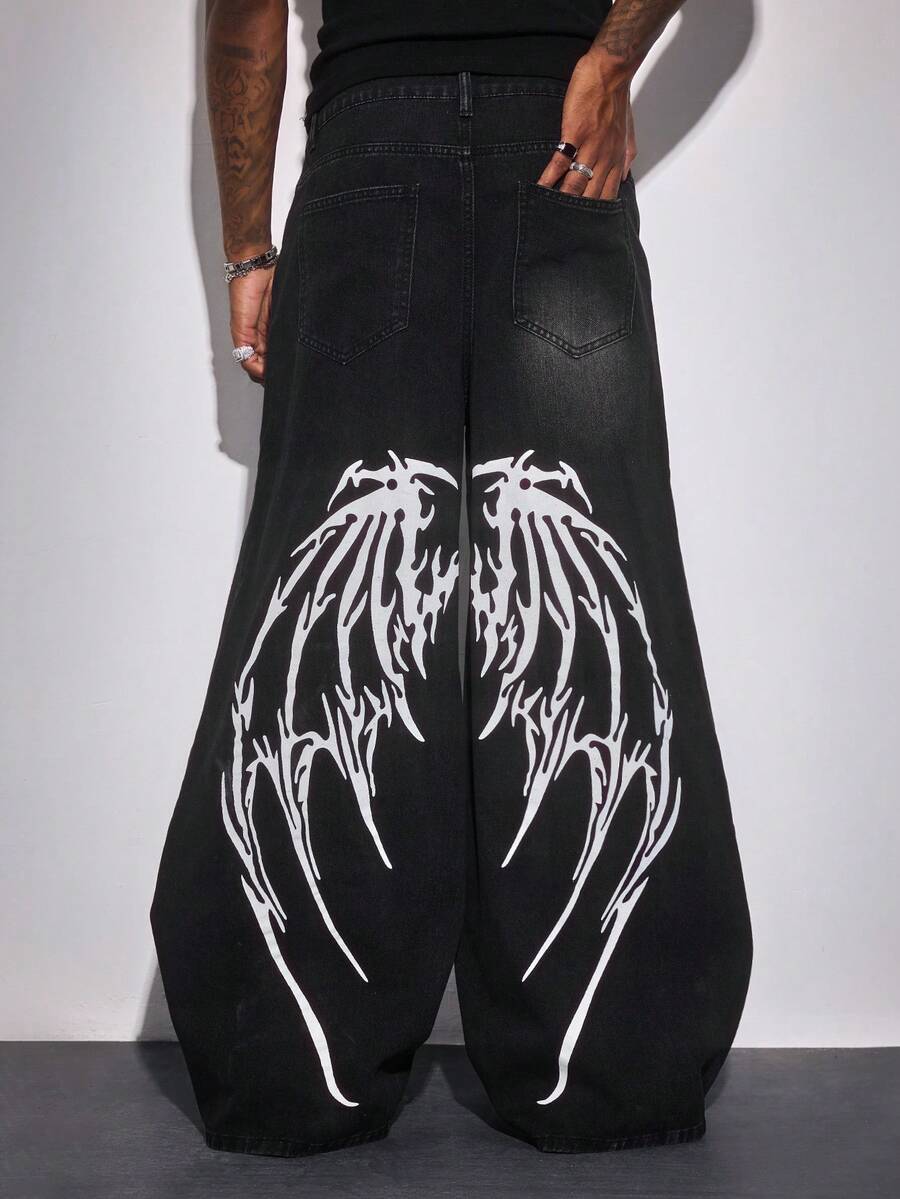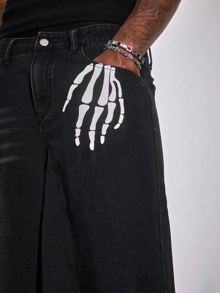 Jeans de pierna ancha con bolsillo y gráfico de calavera y mano, de corte holgado para hombre