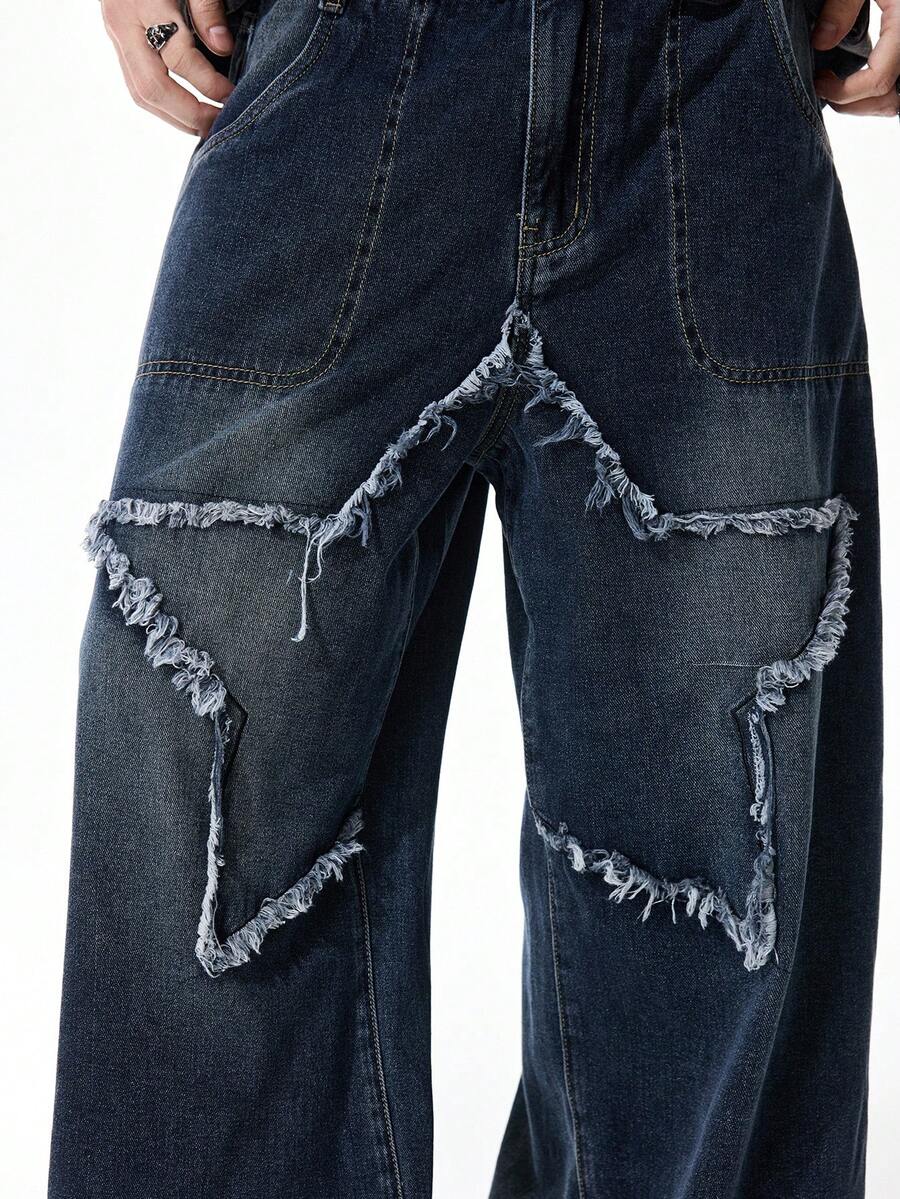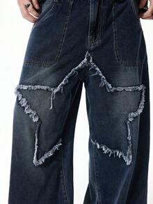 Jeans personalizados para hombres con pierna ancha, bolsillos y bordado de estrella de cinco puntas en contraste de color