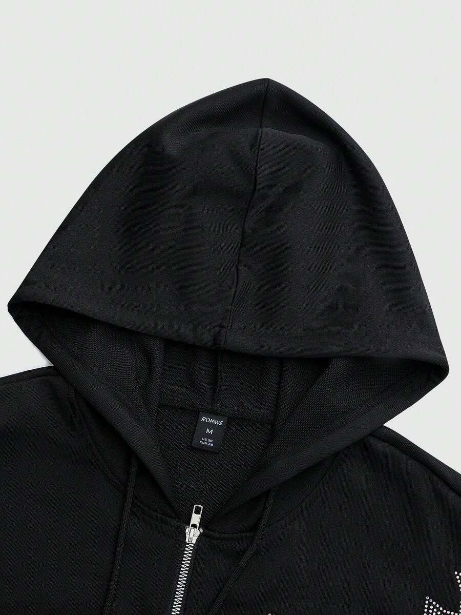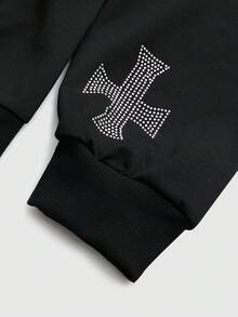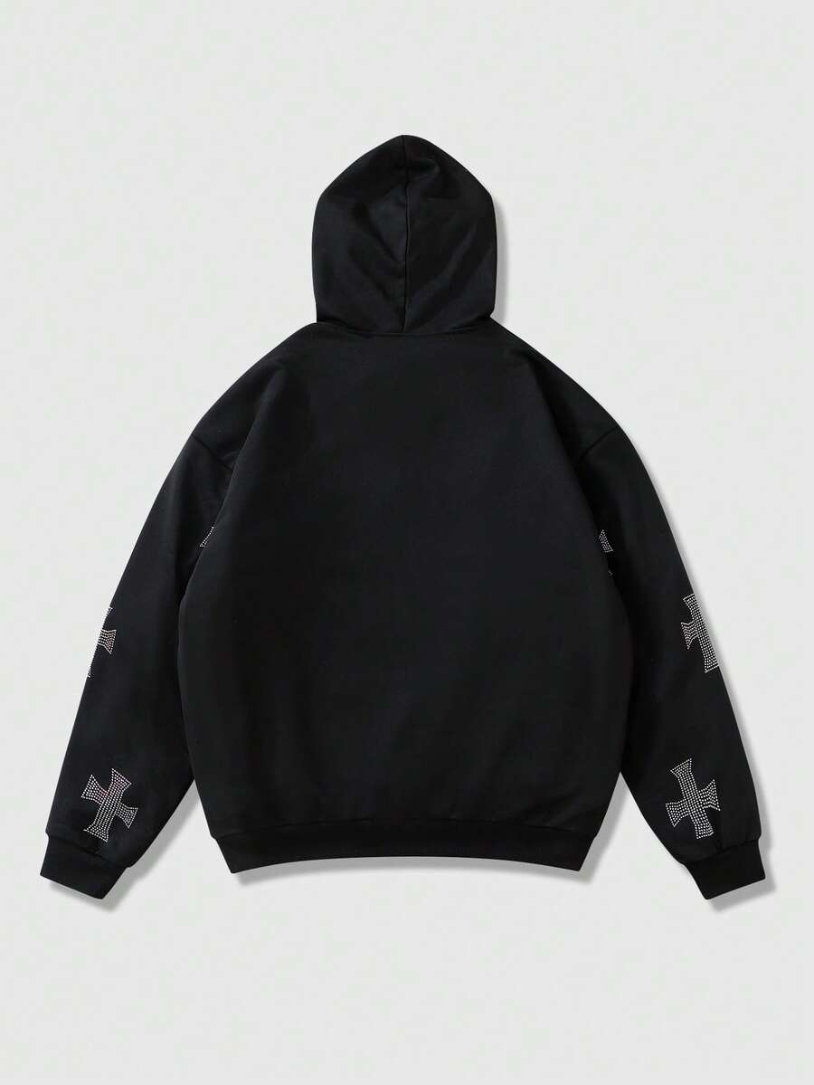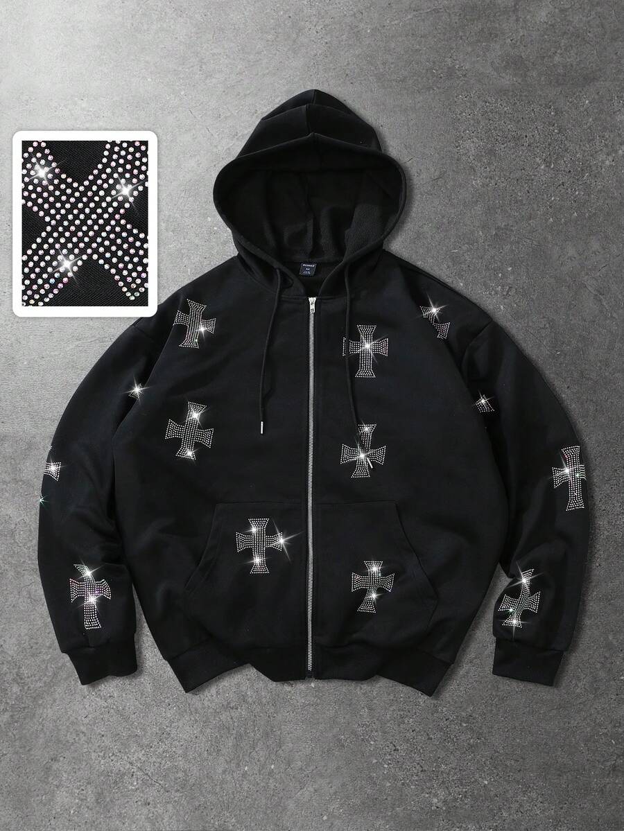 Sudadera con capucha con cremallera y cordón, con gráfico de cruz de rhinestone para hombres