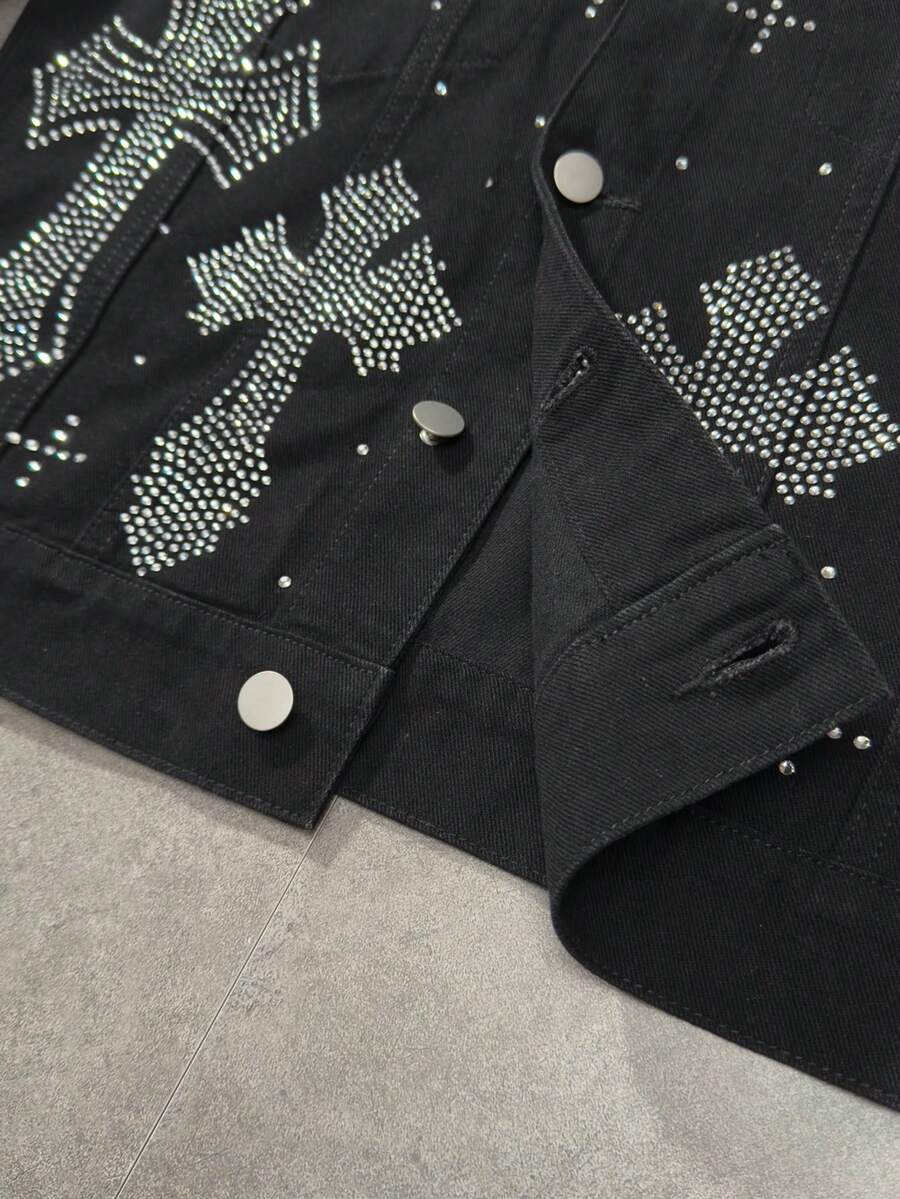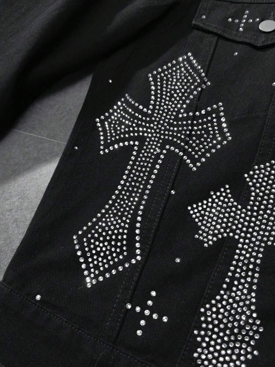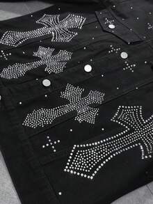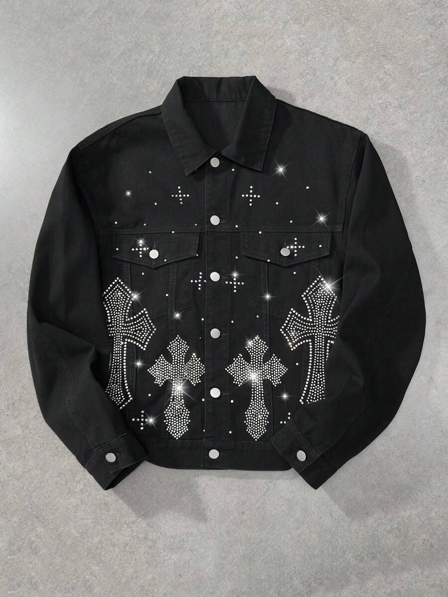 Chaqueta vaquera de manga larga con un solo botonadura y patrón de cruz de rhinestone para hombres