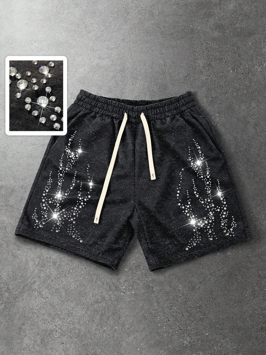 Pantalones cortos casuales con cordón en la cintura y bolsillos con diseño de llama de rhinestone para hombre