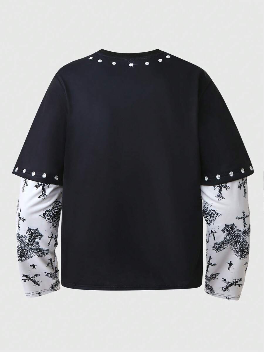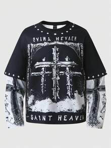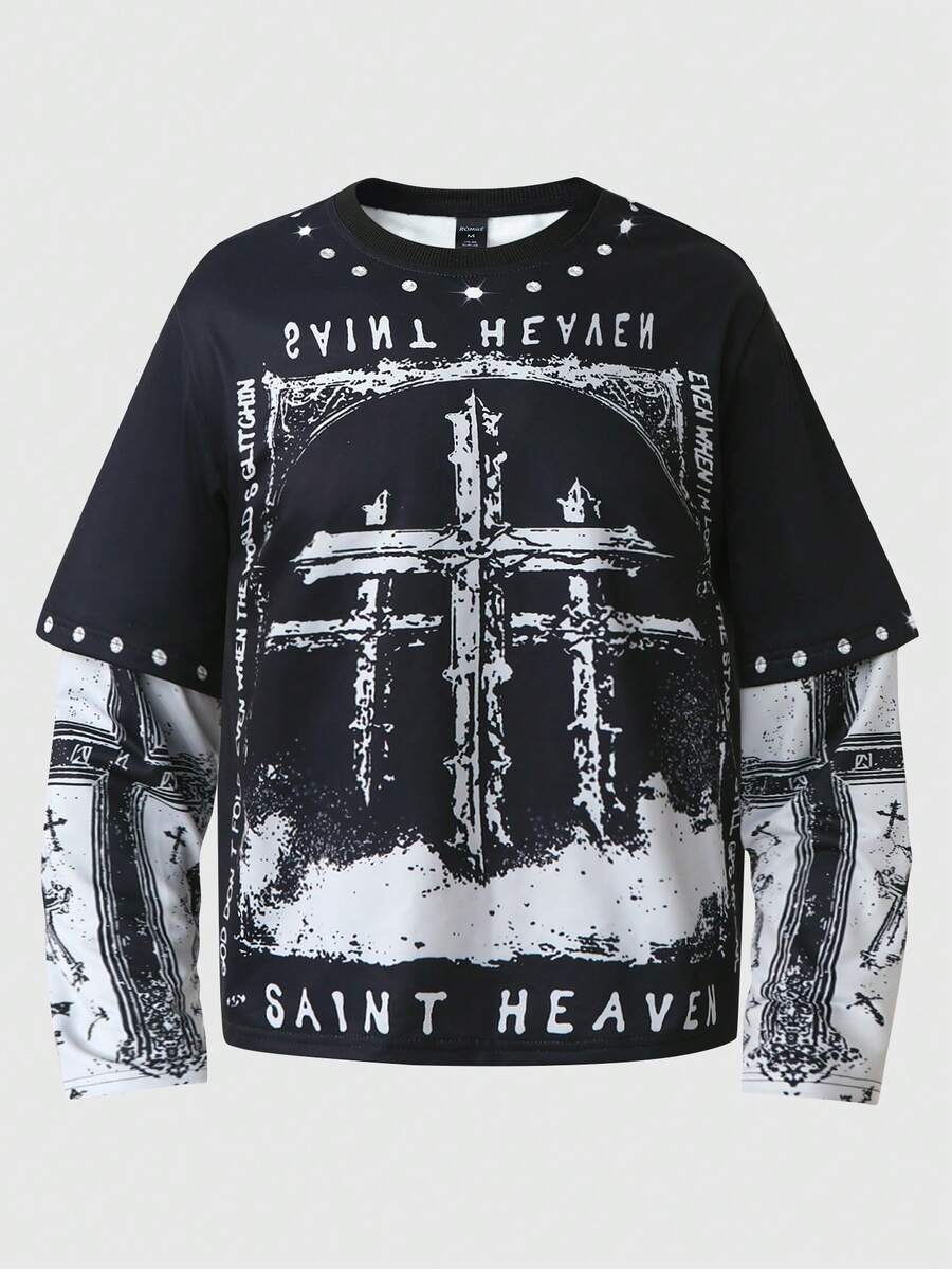 Camiseta de cuello redondo para hombre 2 en 1 con cuello redondo, manga larga, sudadera con estampado de cruz y fe, adecuada para uso casual diario