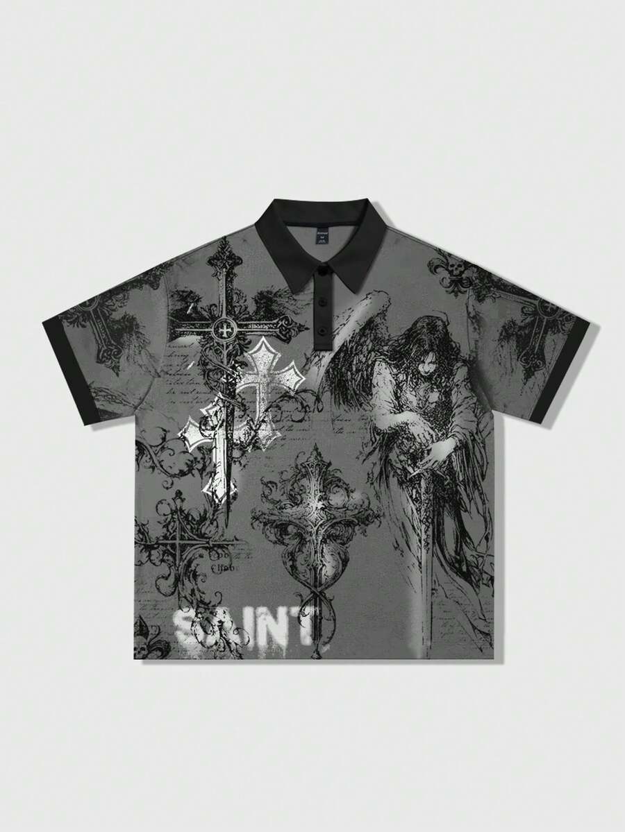 Camiseta polo de manga corta casual para hombre, estampado de agua con estilo universitario punk