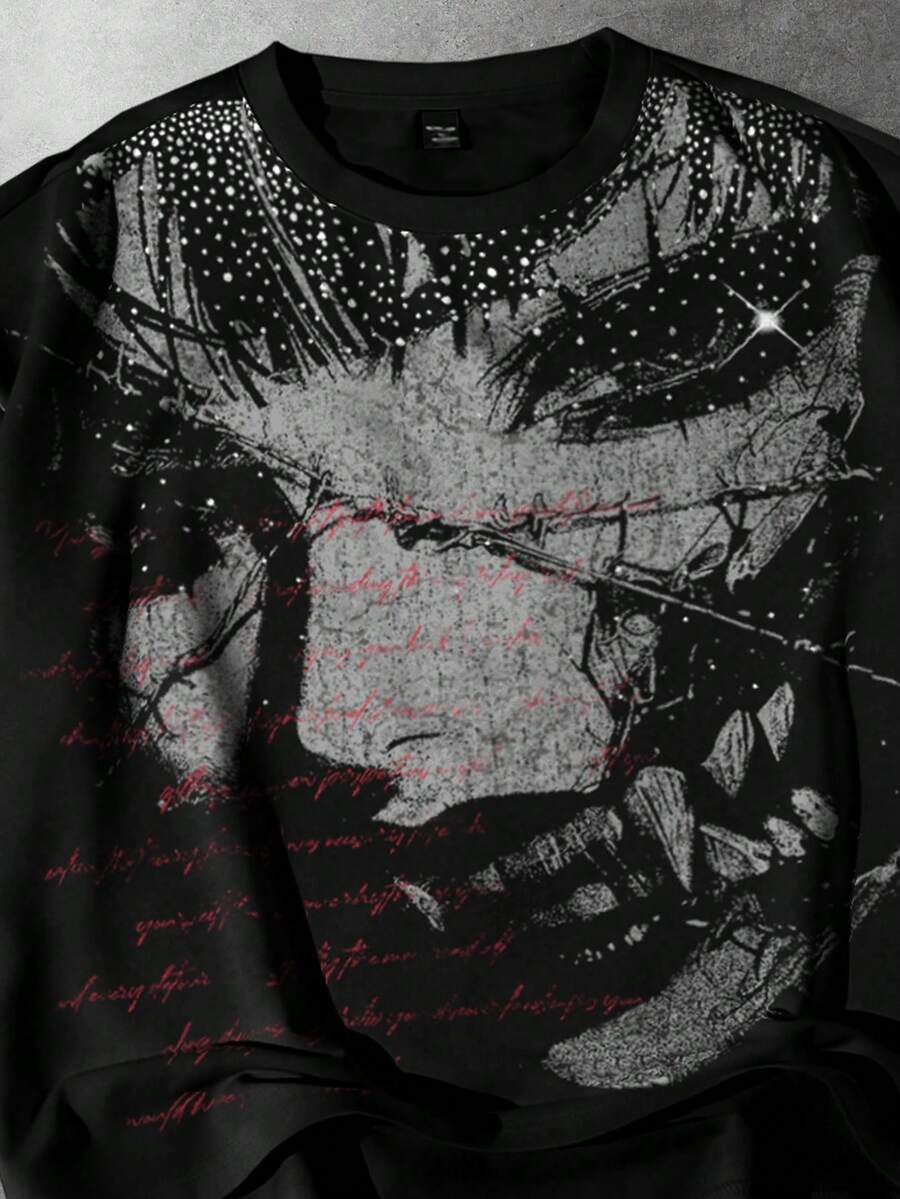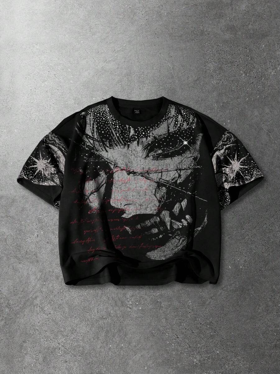 Camiseta de manga corta casual con cuello redondo, estampado de lema y figura, con adorno de rhinestones, corte holgado para hombre