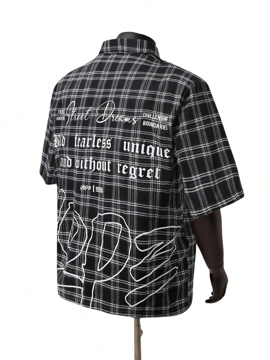 Camisa casual de manga corta con estampado de cuadros y eslogan para hombres