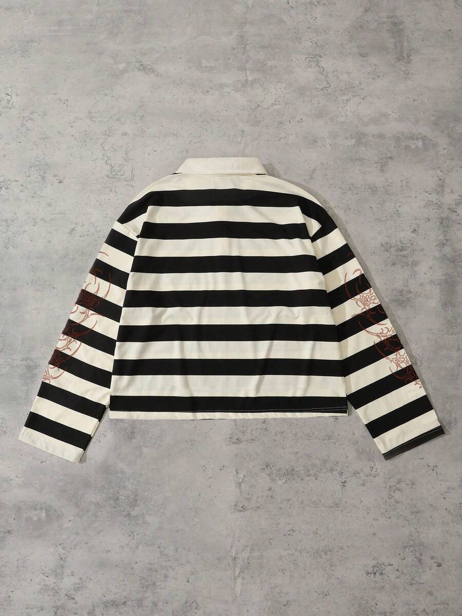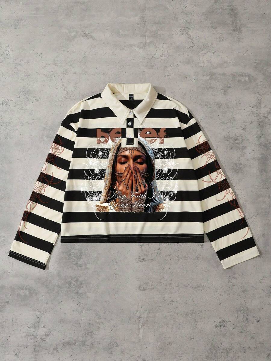 Camisa polo de manga larga con rayas y estampado de figura callejera para hombres