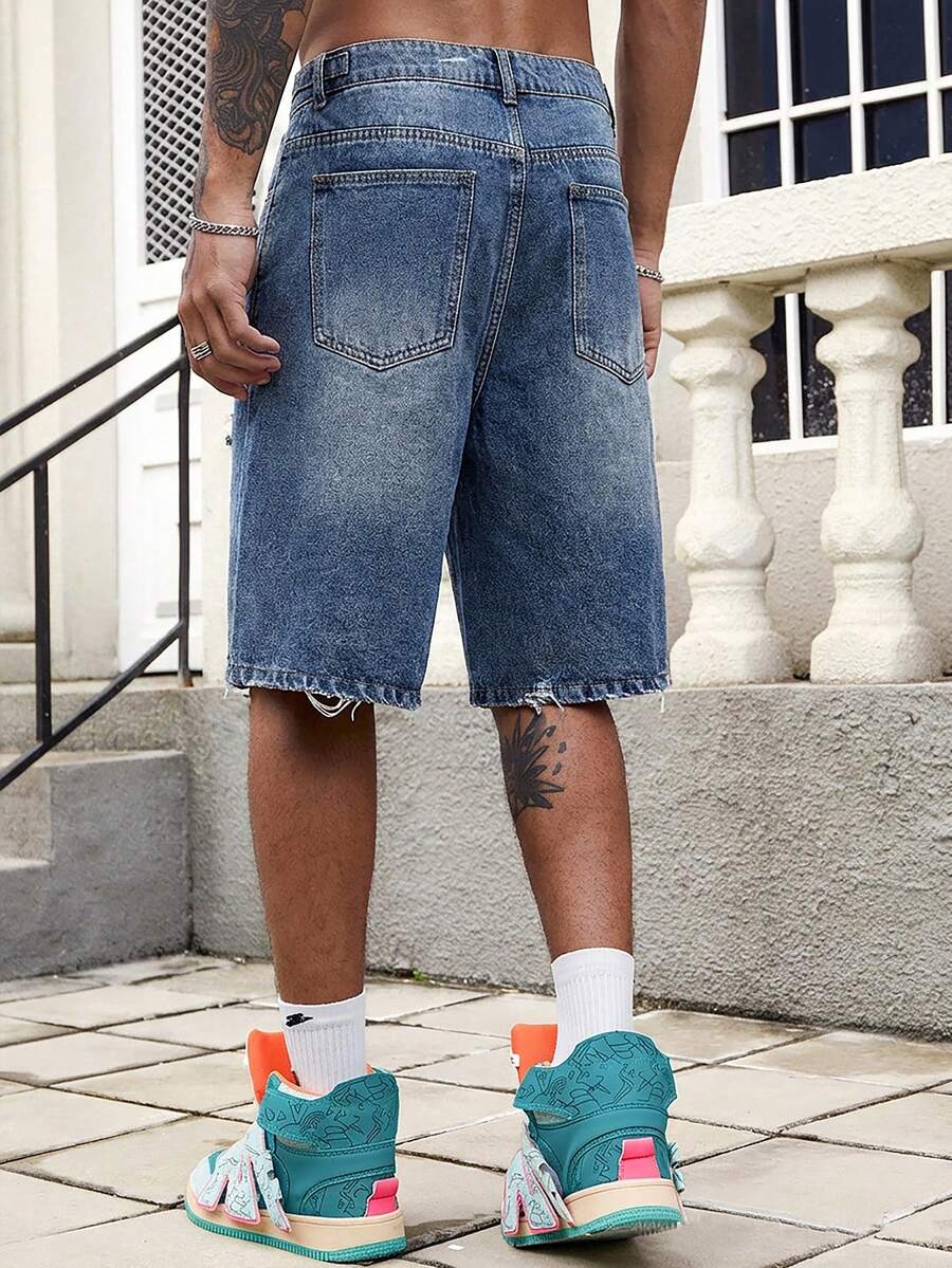 Pantalones cortos de mezclilla con estampado de letras y llamas, con aplicaciones de rhinestones y dobladillo deshilachado, para hombres, estilo casual de moda de calle en verano