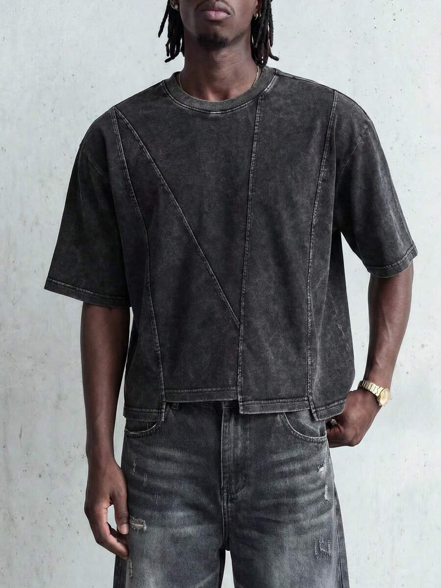 Camiseta casual de cuello redondo de manga corta con efecto lavado y desgastado para hombres