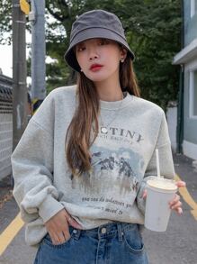 Sudadera con gráfico de montaña y eslogan, hombros caídos, térmica, ropa de mujer de otoño