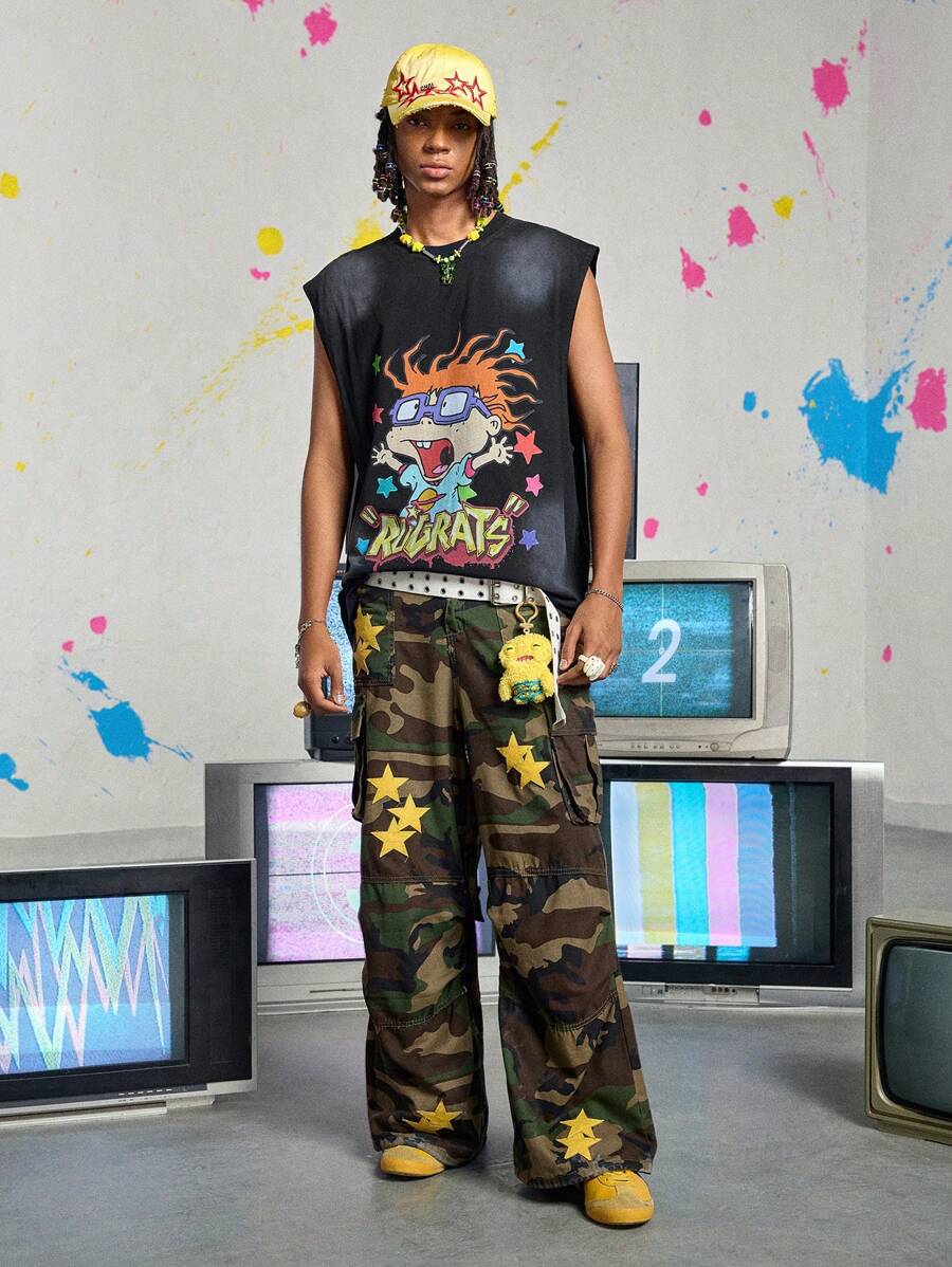 Nick 90's X ROMWE Camiseta de tirantes con estampado de dibujos animados lavada en nieve para hombre, apta para uso diario
