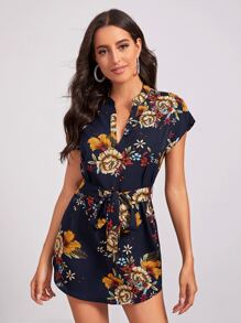 Vestido floral bajo curvo con cinturón de cuello V