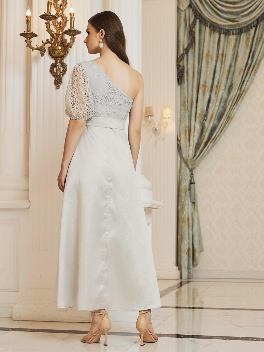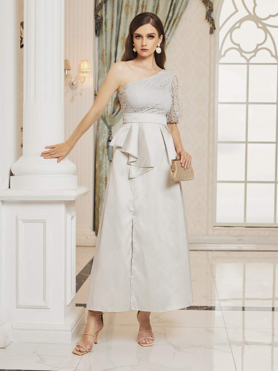 Vestido de un hombro panel con encaje fruncido bajo con abertura