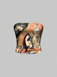ROMWE Avant Top corto sin mangas con estampado de Buda y flores en estilo oriental para mujeres