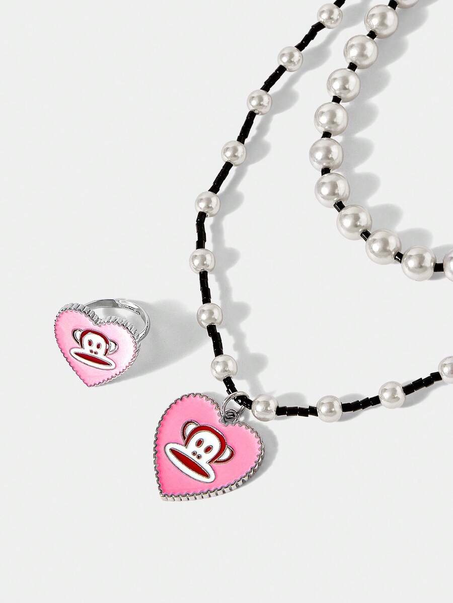 Paul Frank X ROMWE Conjunto de joyería de anillo y collar con diseño de corazón de dibujos animados