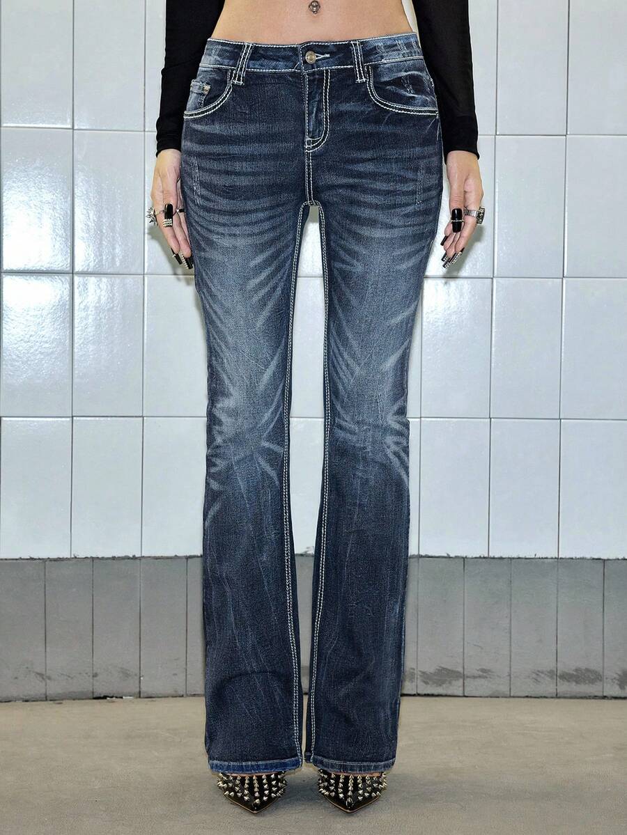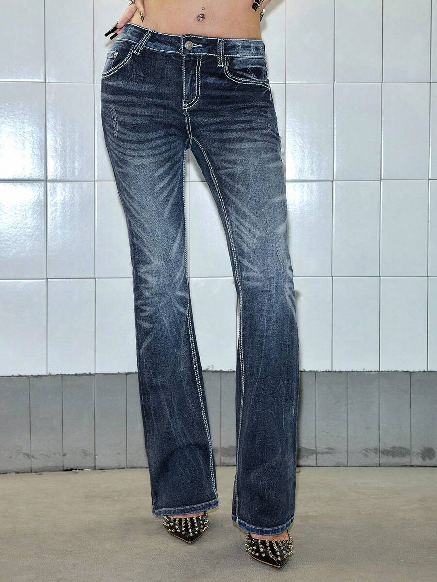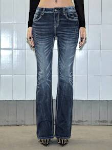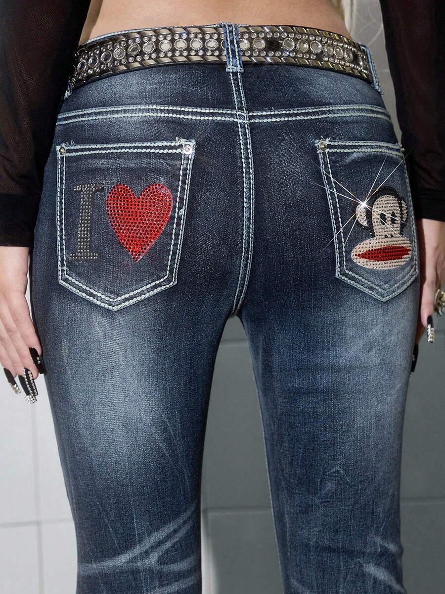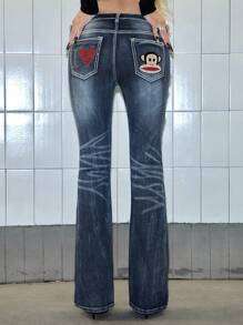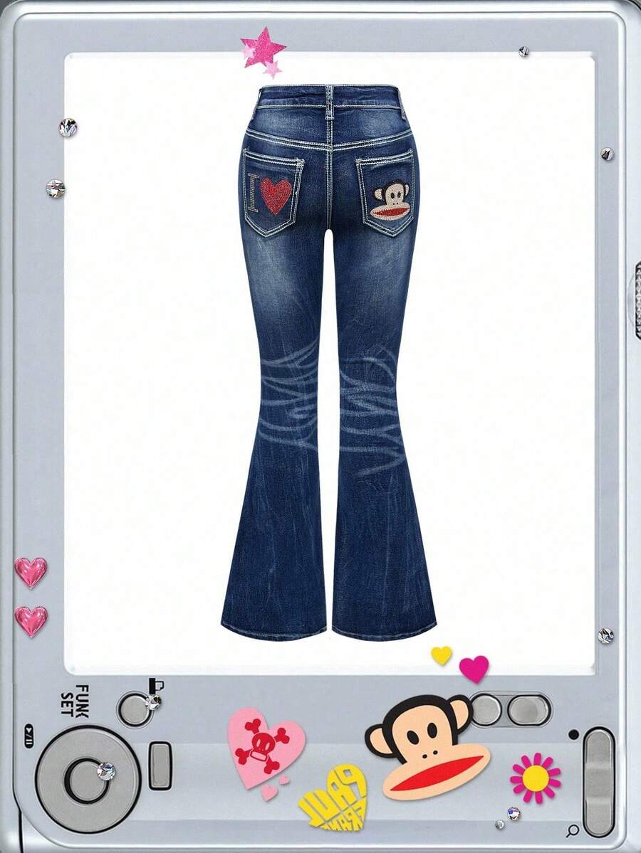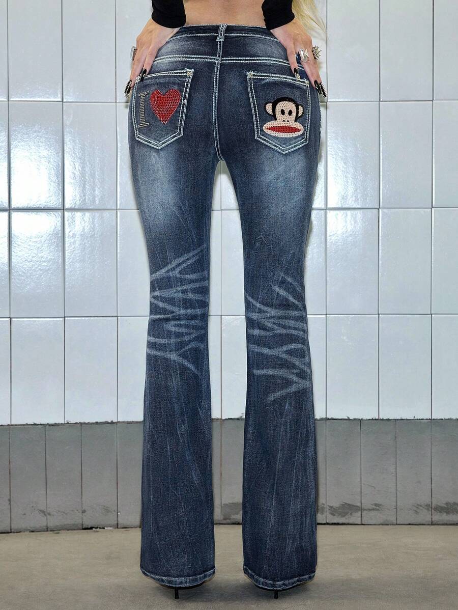 Paul Frank X ROMWE Jeans acampanados de talle bajo con efecto desgastado, bolsillos con estampado de dibujos animados con cristales, estilo vintage Y2K para mujeres