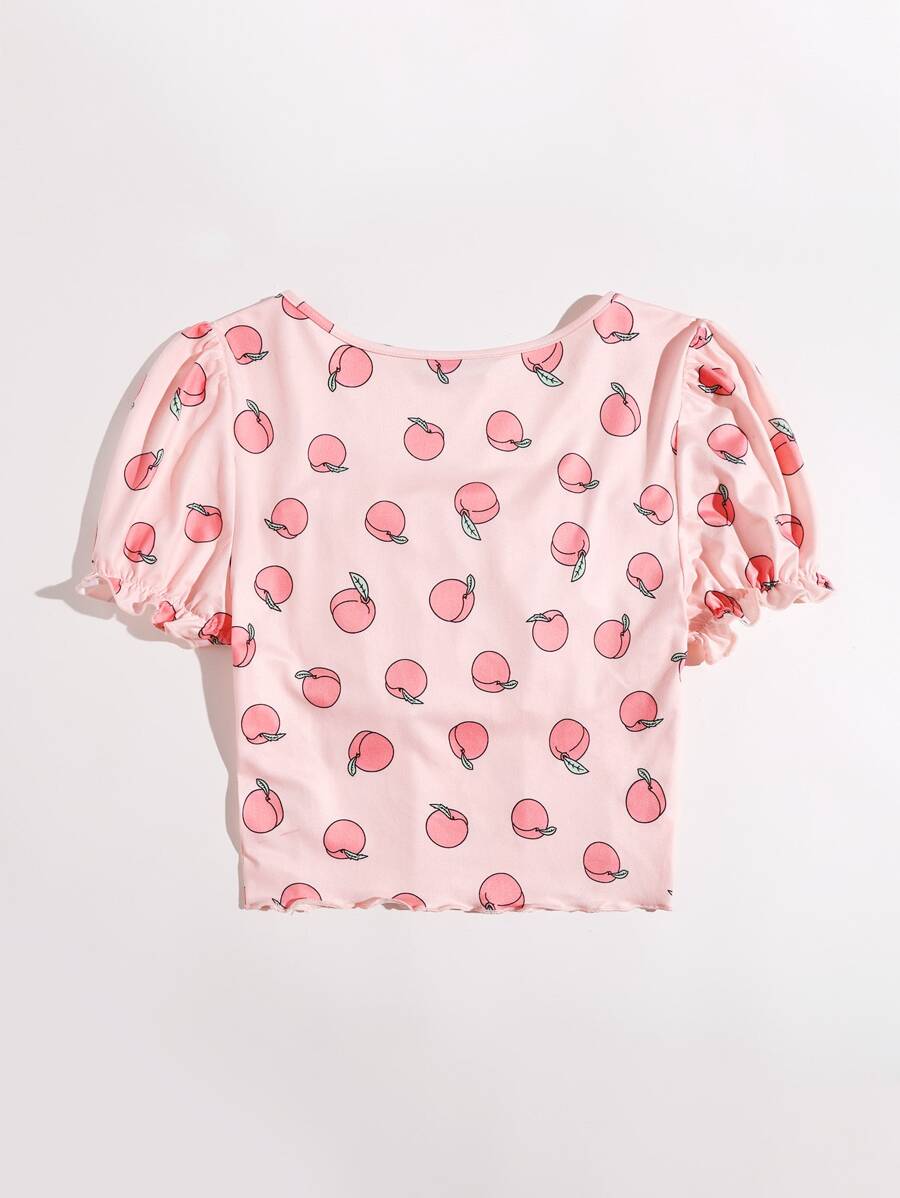 Camiseta de pecho ribete fruncido con estampado de melocotón