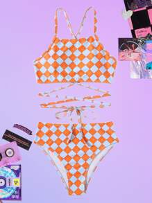 Bikini de cuadros con cordones para la playa de verano