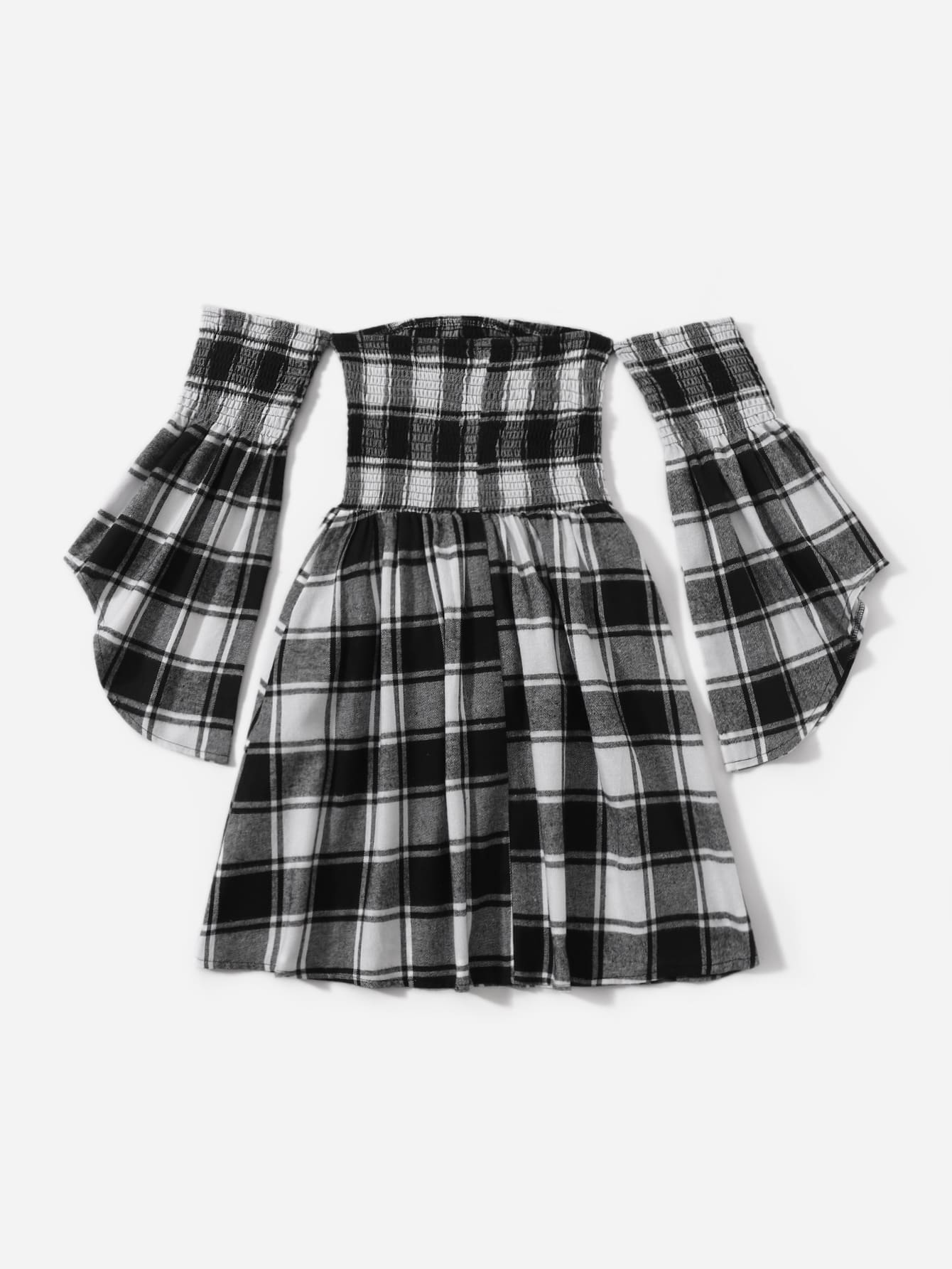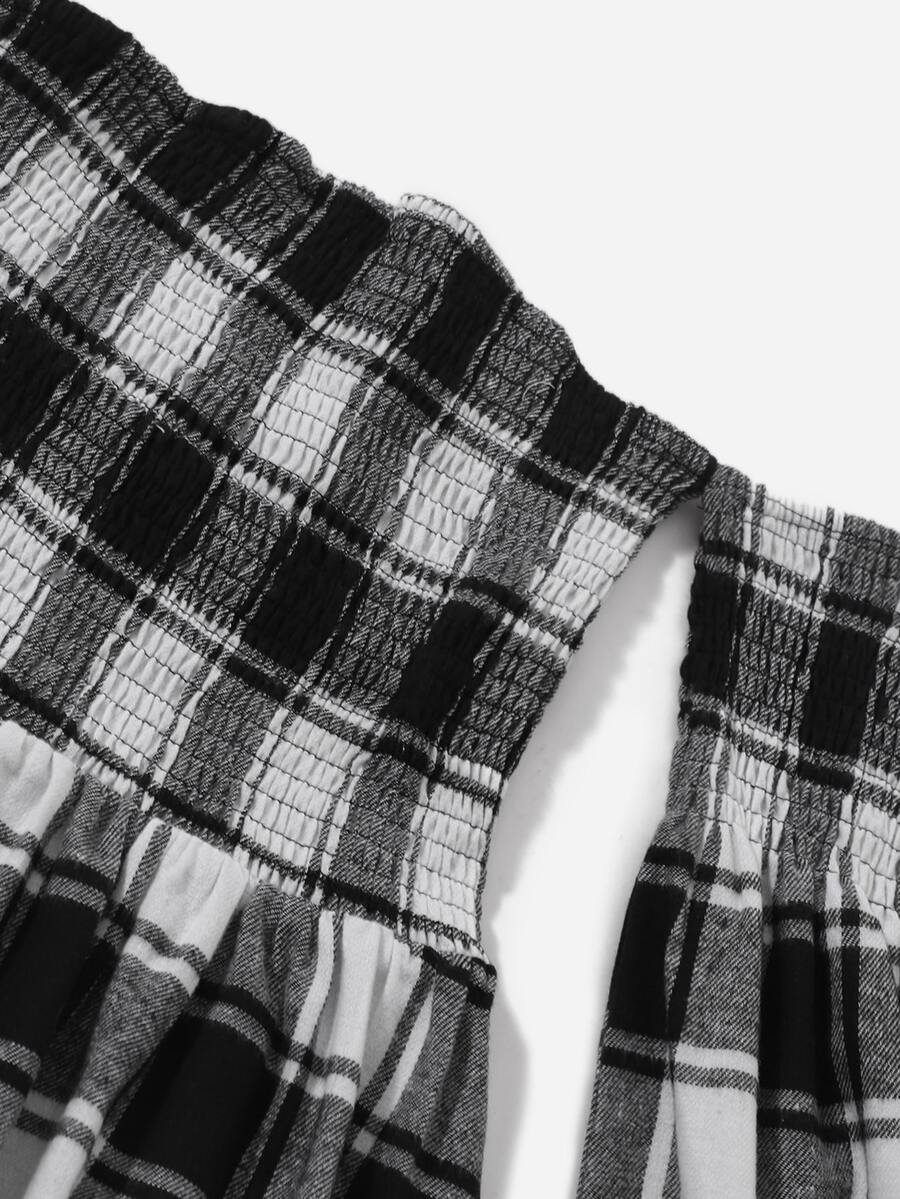 Vestido con fruncido con estampado de cuadros de hombros descubiertos