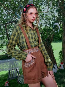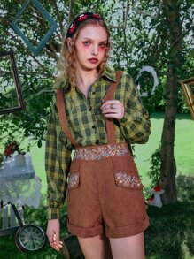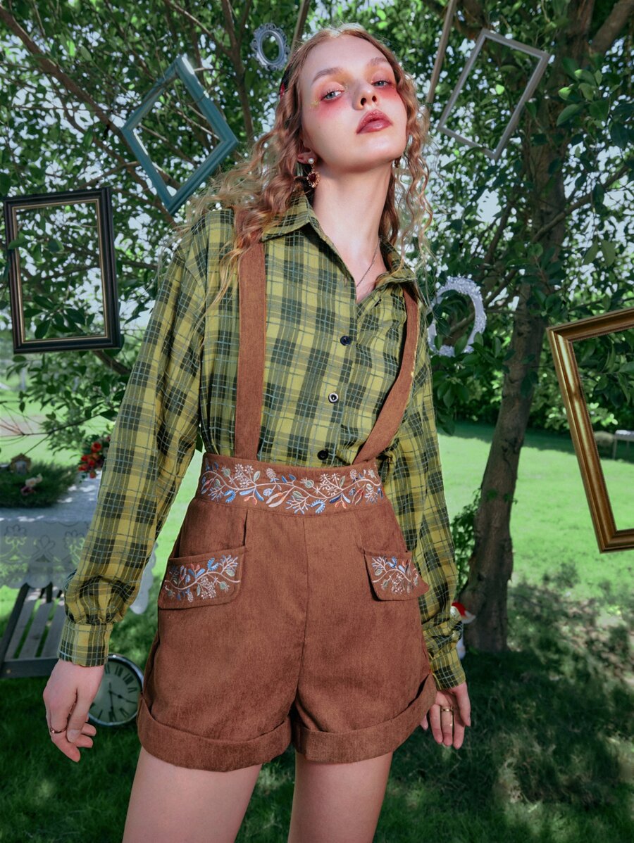 Shorts overol con bordado de planta
