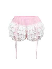 Kawaii Pantalones cortos con cintura con cordón, volantes y dobladillo de encaje, para la escuela, talla grande
