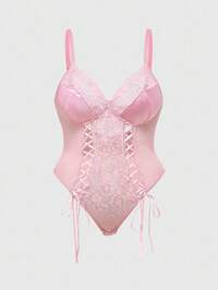 Kawaii Mono de lencería con parches de encaje y malla, con lazo, para tallas grandes