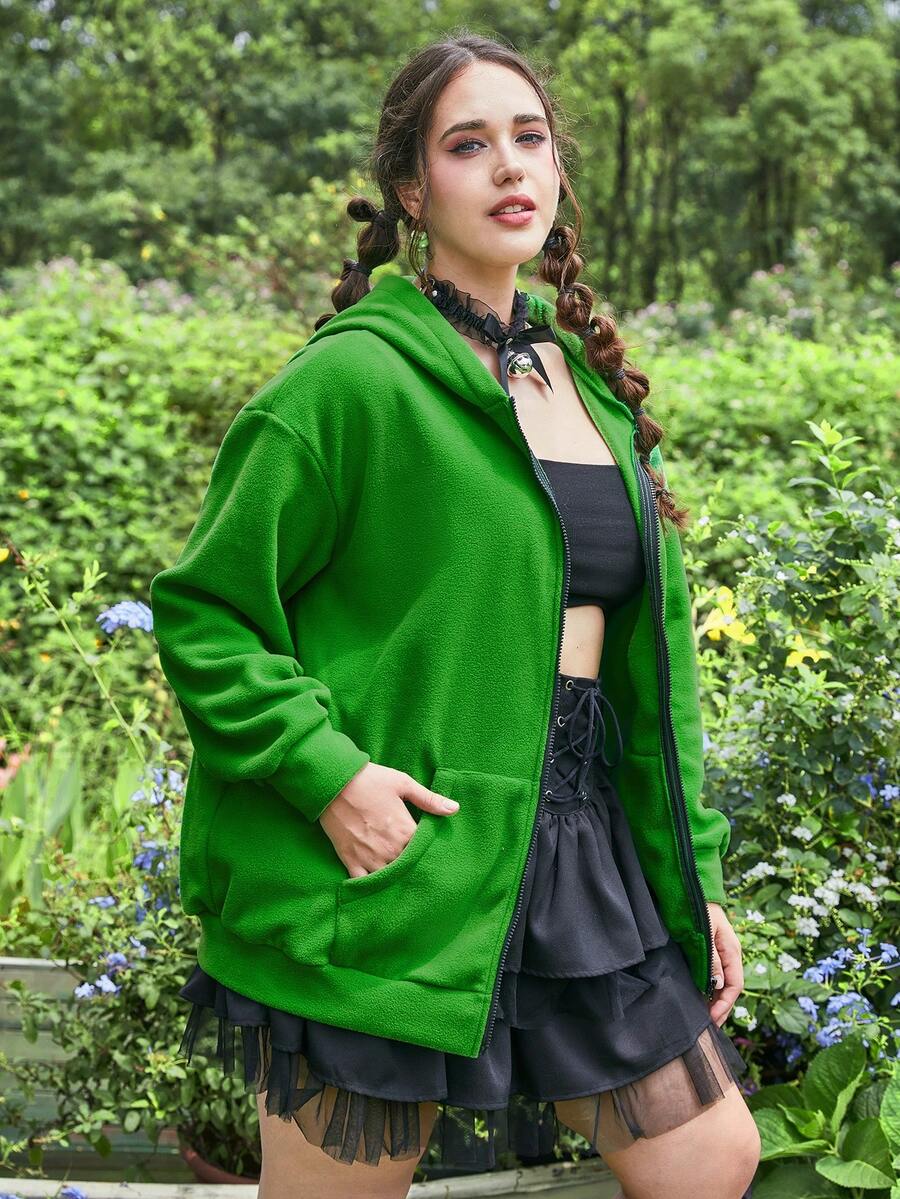 Kawaii Talla grande Abrigo con capucha con estampado de dibujos animados con cremallera de hombros caídos