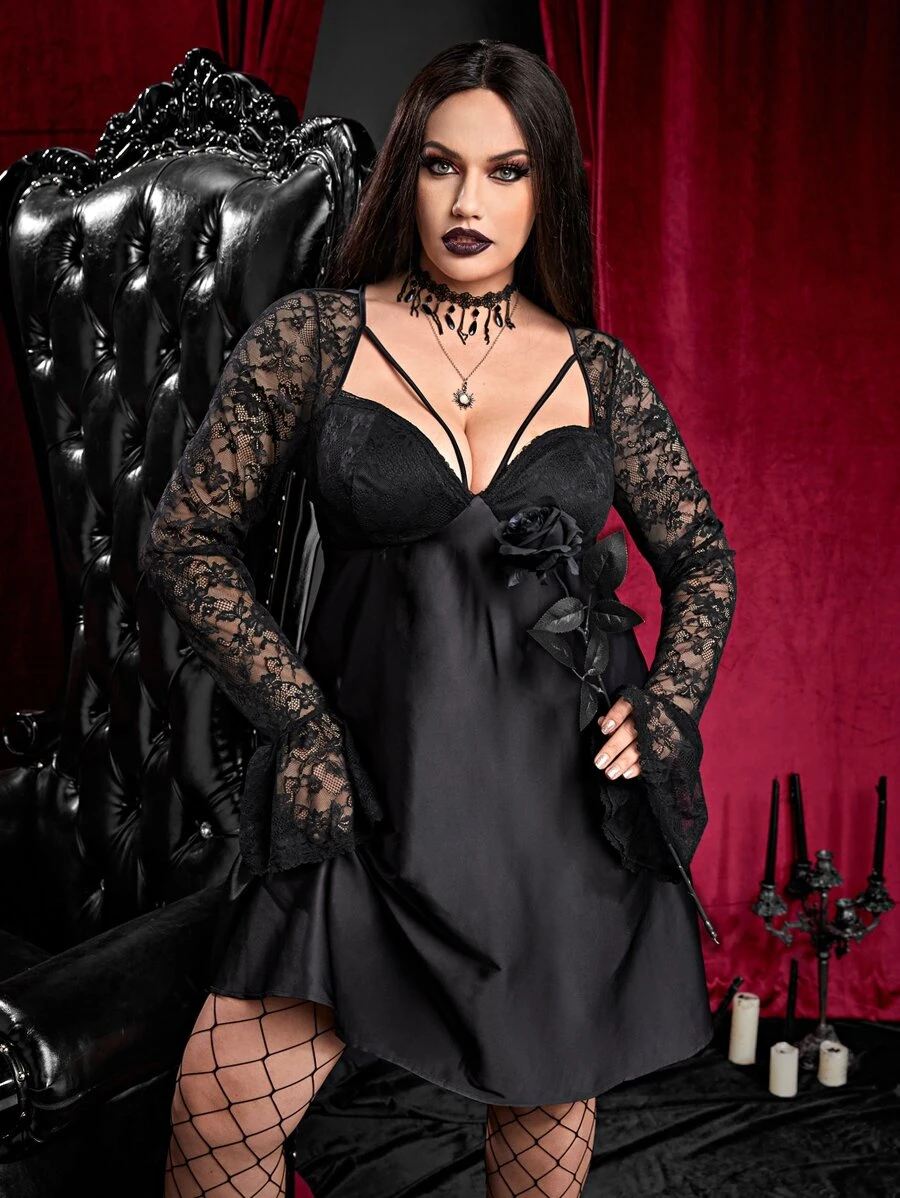 Vestido con encaje en contraste de manga con volante con abertura escote corazón de satén