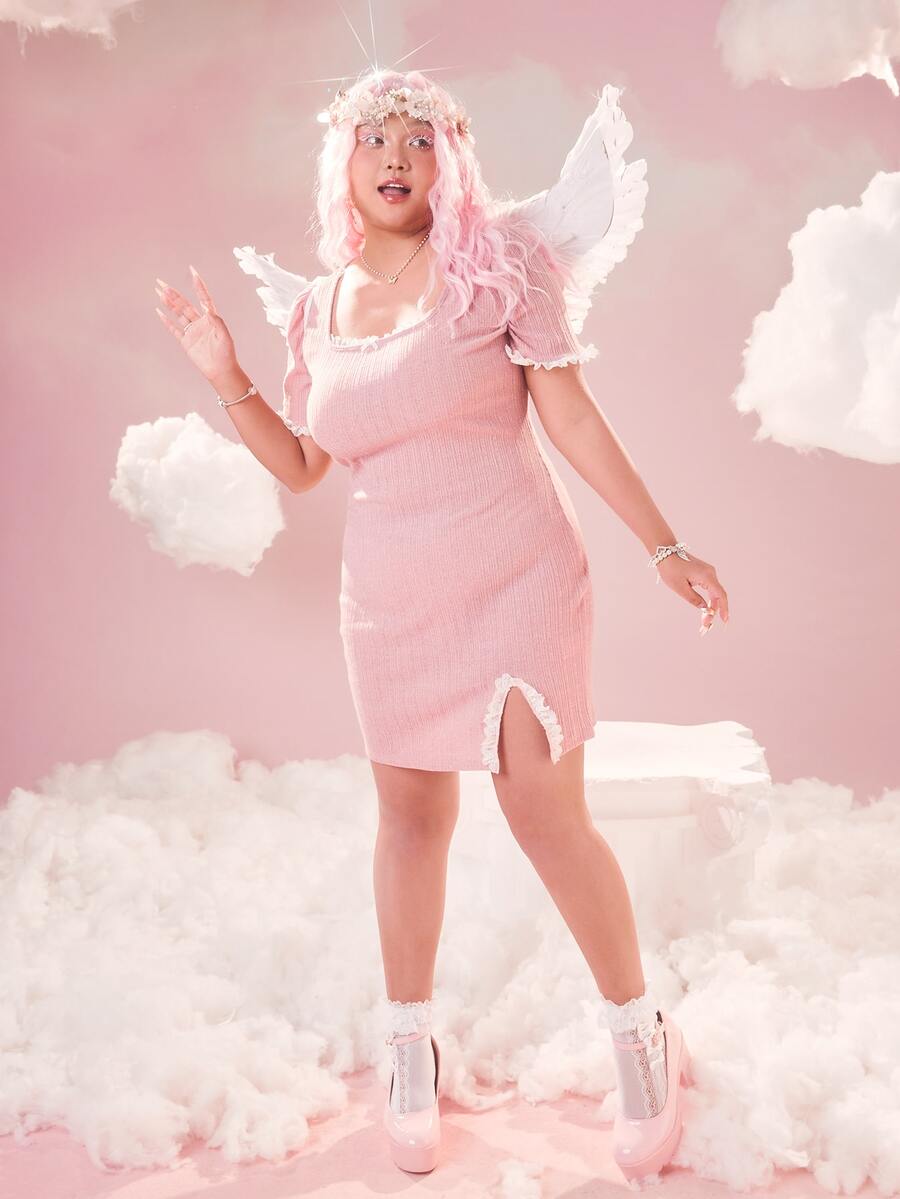 Vestido De Talla Grande Con Encaje De Contraste Y Dobladillo Dividido