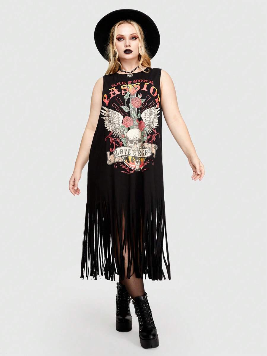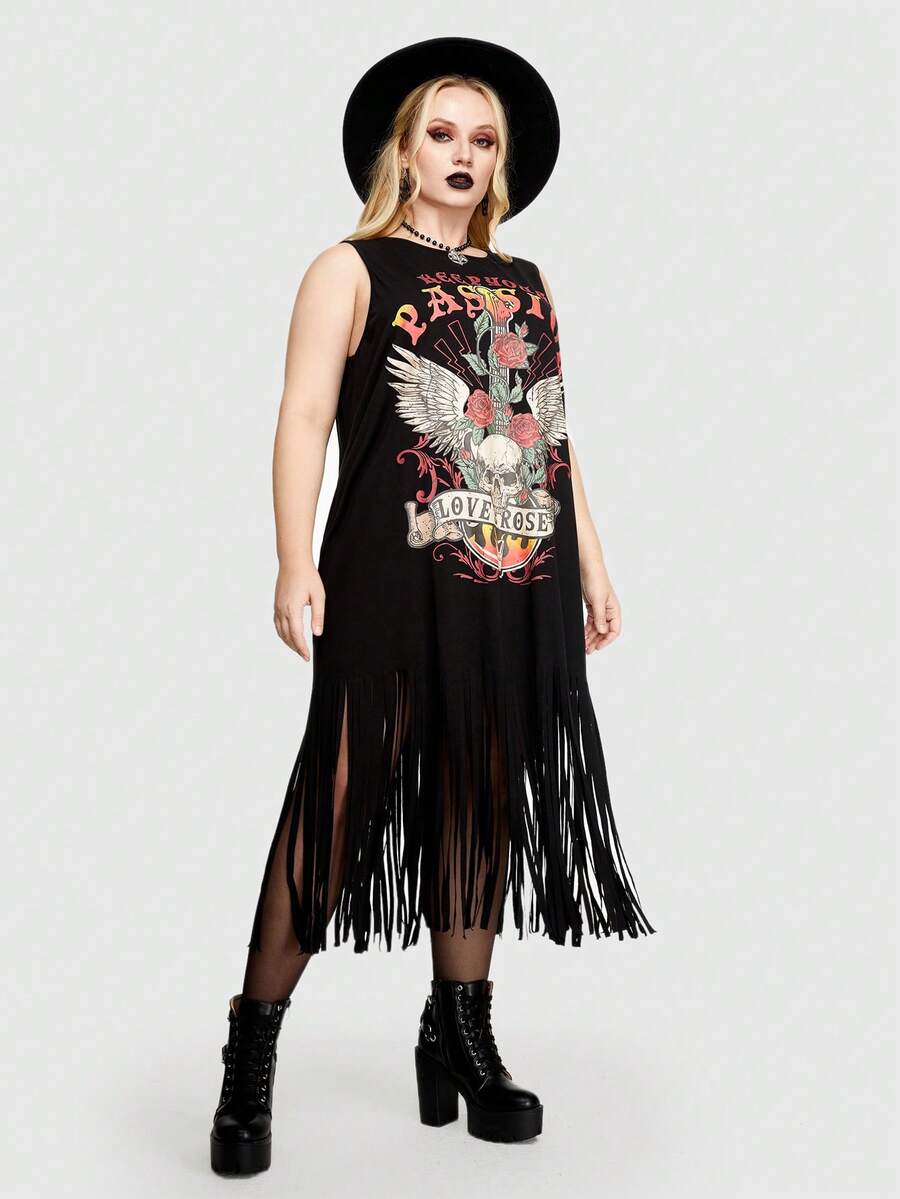 Vestido Sin Mangas Con Estampado Floral Y Águila, Bajo Con Flecos, Talla Grande