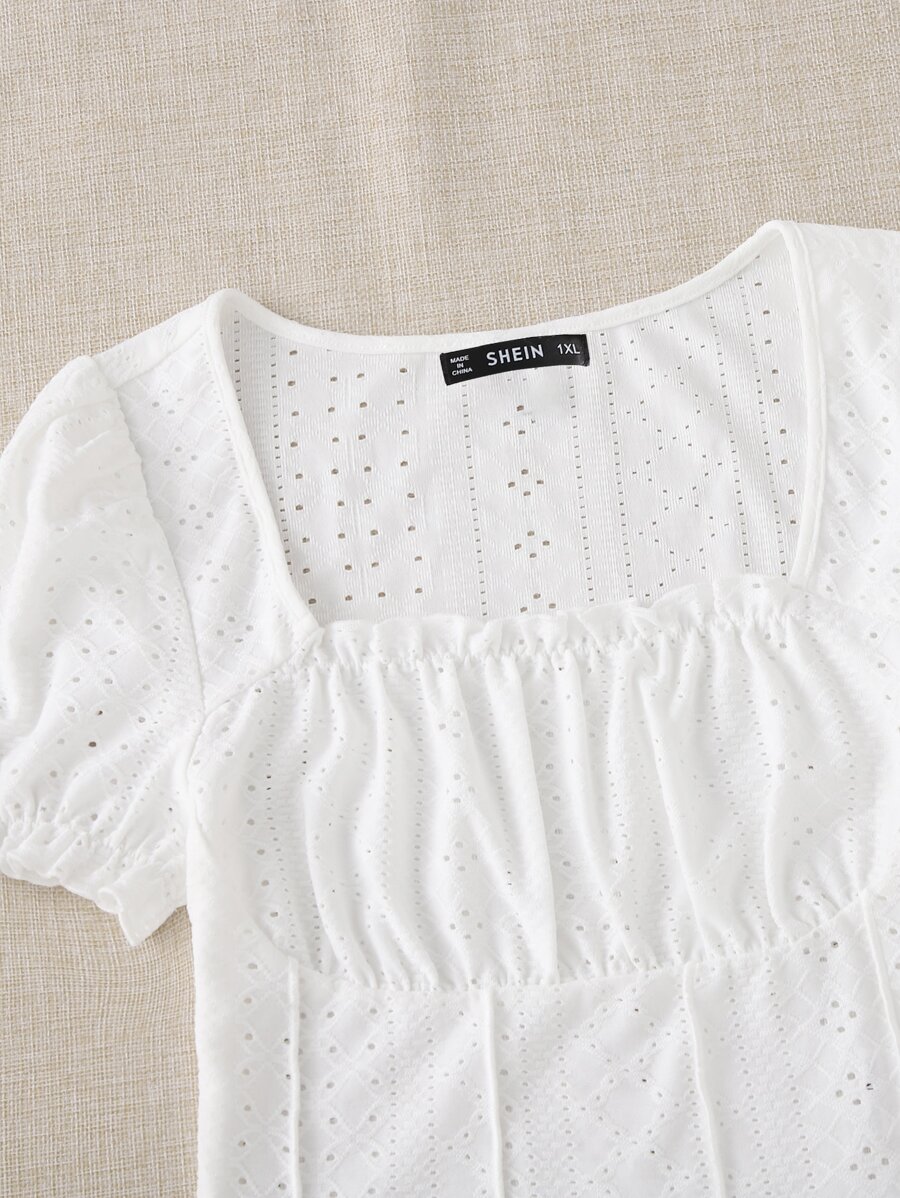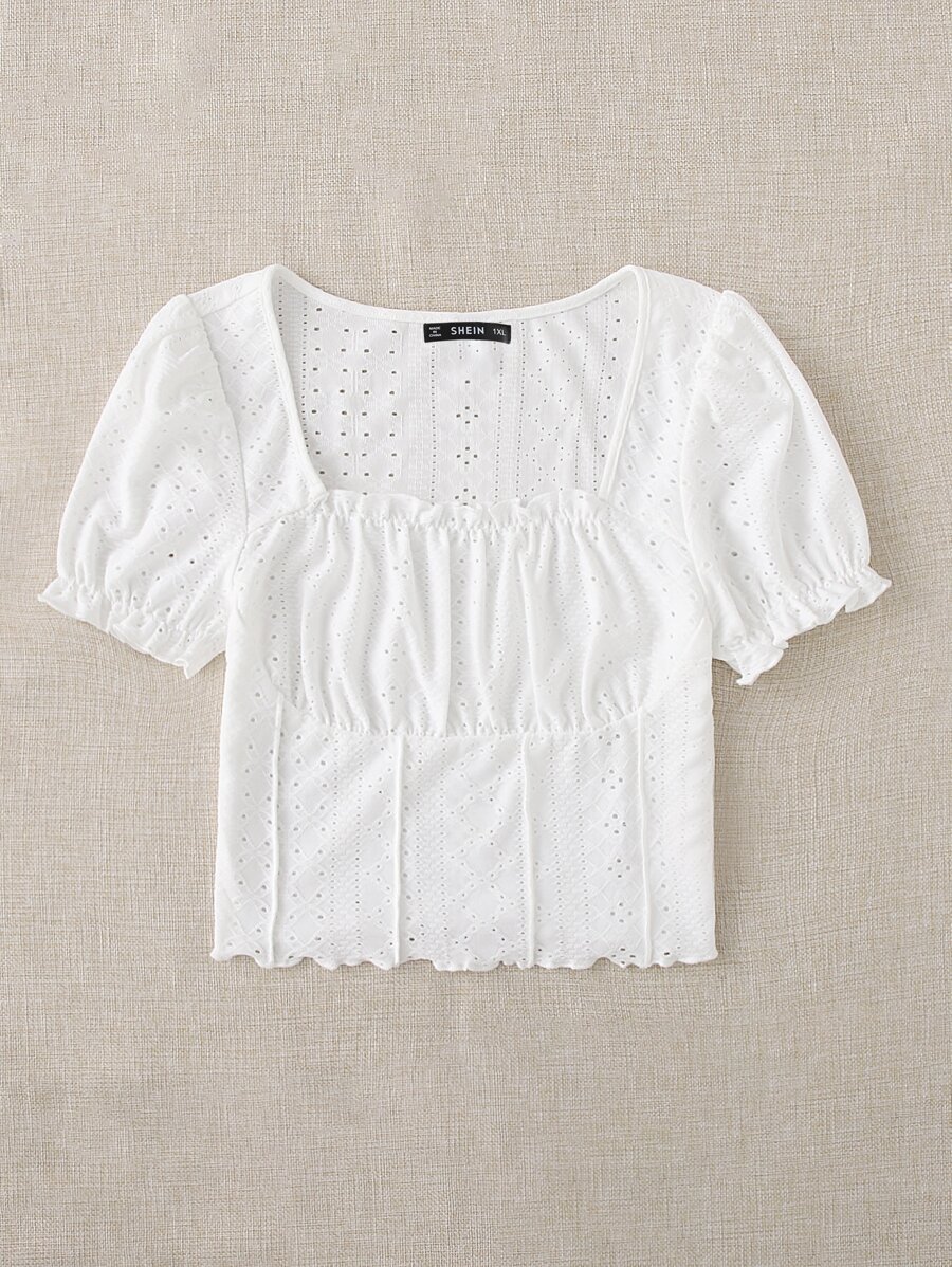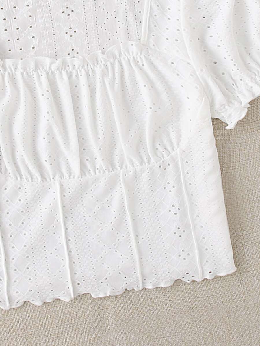 Camiseta con bordado con ojal fruncido de manga farol ribete en forma de lechuga