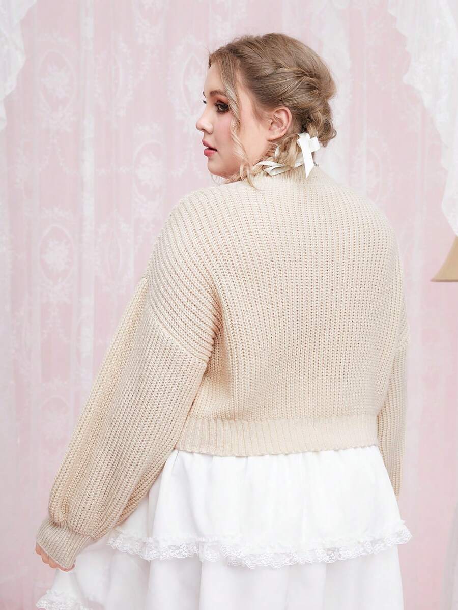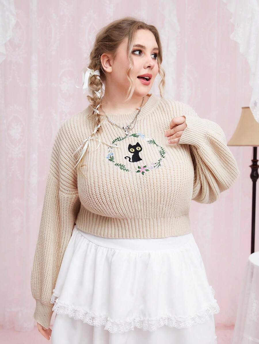 Kawaii Talla grande Jersey floral con gato con bordado de hombros caídos