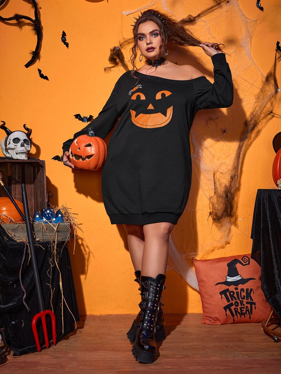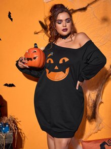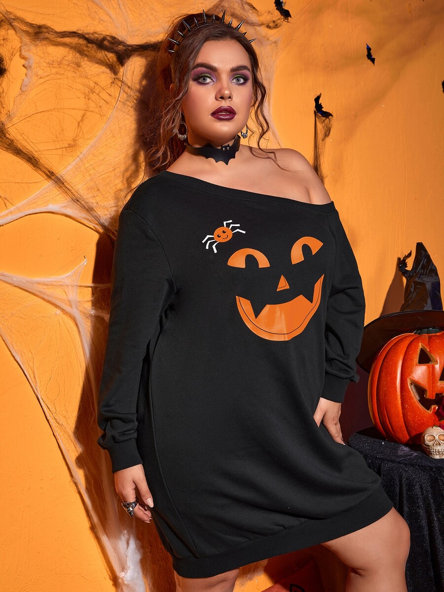 Vestido sudadera de cuello asimétrico con estampado de calabaza y araña de Halloween