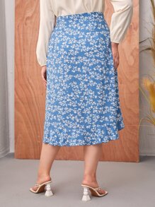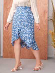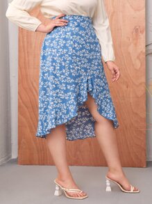 Falda de talle alto con estampado floral ribete con fruncido irregular