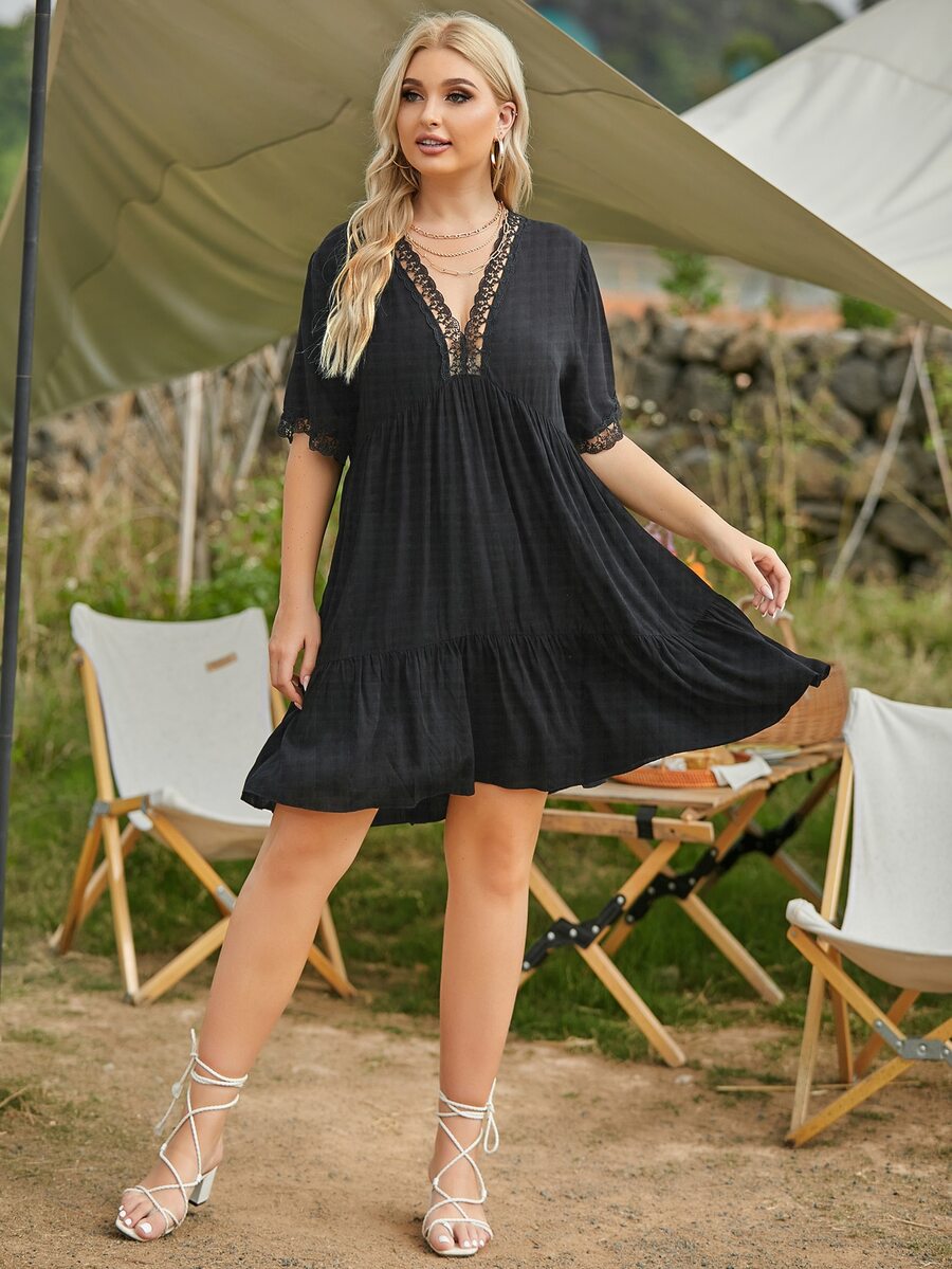 Vestido Estilo Delantal Plus Con Panel De Encaje, Orilla Con Volantes